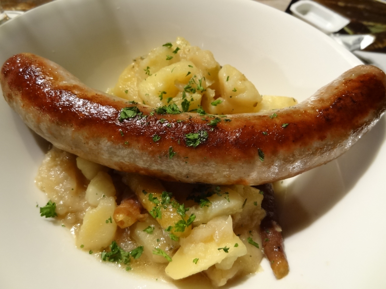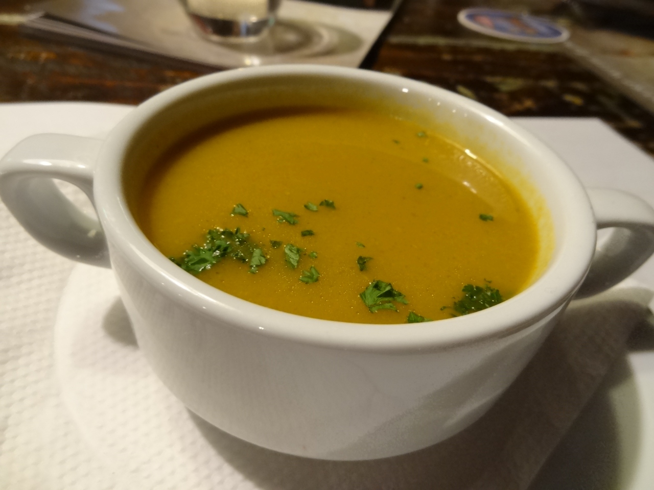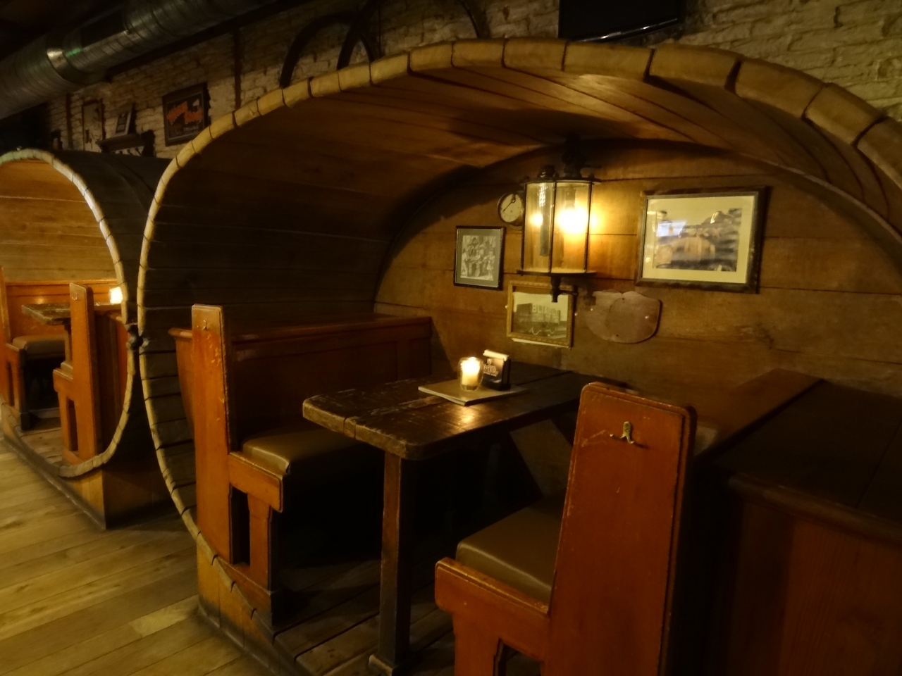 ベルギーのアントワープ市内にあるレストランです。店内は木製のテーブル・椅子で統一されていて、あったかみのあるとてもいい雰囲気です。私たちが座った席の隣には大きな楕円形の樽を横にしてテーブルをはめ込んだ造りにユニークさが感じられました。最初にベルギービールで乾杯。のど越しすっきりの味。さすがベルギービールです。出された料理は野菜煮込みスープと大きなソーセージ、デザートには大きなワッフル。スープはとてもまろやかな味。ソーセージは肉の味を最大限に引き出していて、とても美味しかったです。ワッフルにホイップクリームを乗せて食べてみたら、サクサクと美味しい歯ごたえ。本場のベルギー料理を堪能できて大満足でした。