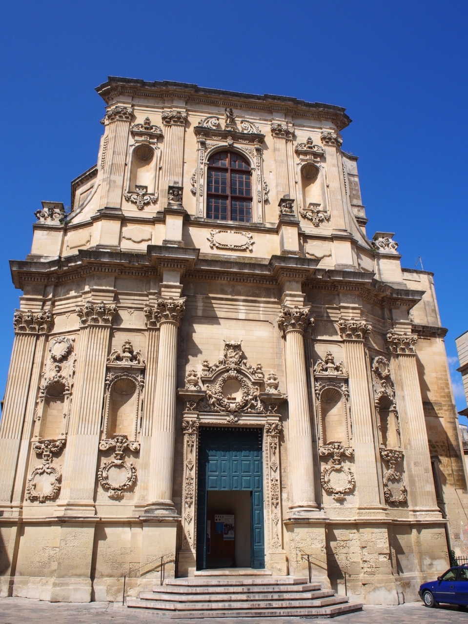 さすがバロックと言うような豪華な教会です。小さいですけれども、天井や壁面は彫刻で埋め尽くされ、絵画も色鮮やかで華やかです。ファサードは円柱をメインにすらりとした印象で、あまり派手にはみえませんが、その分内部がすごいです。