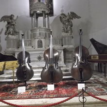 教会の中には、バイオリンが展示してあって、その他楽譜類もあって、楽器の博物館なのかと思いました。 チェロ等も美しく展示。