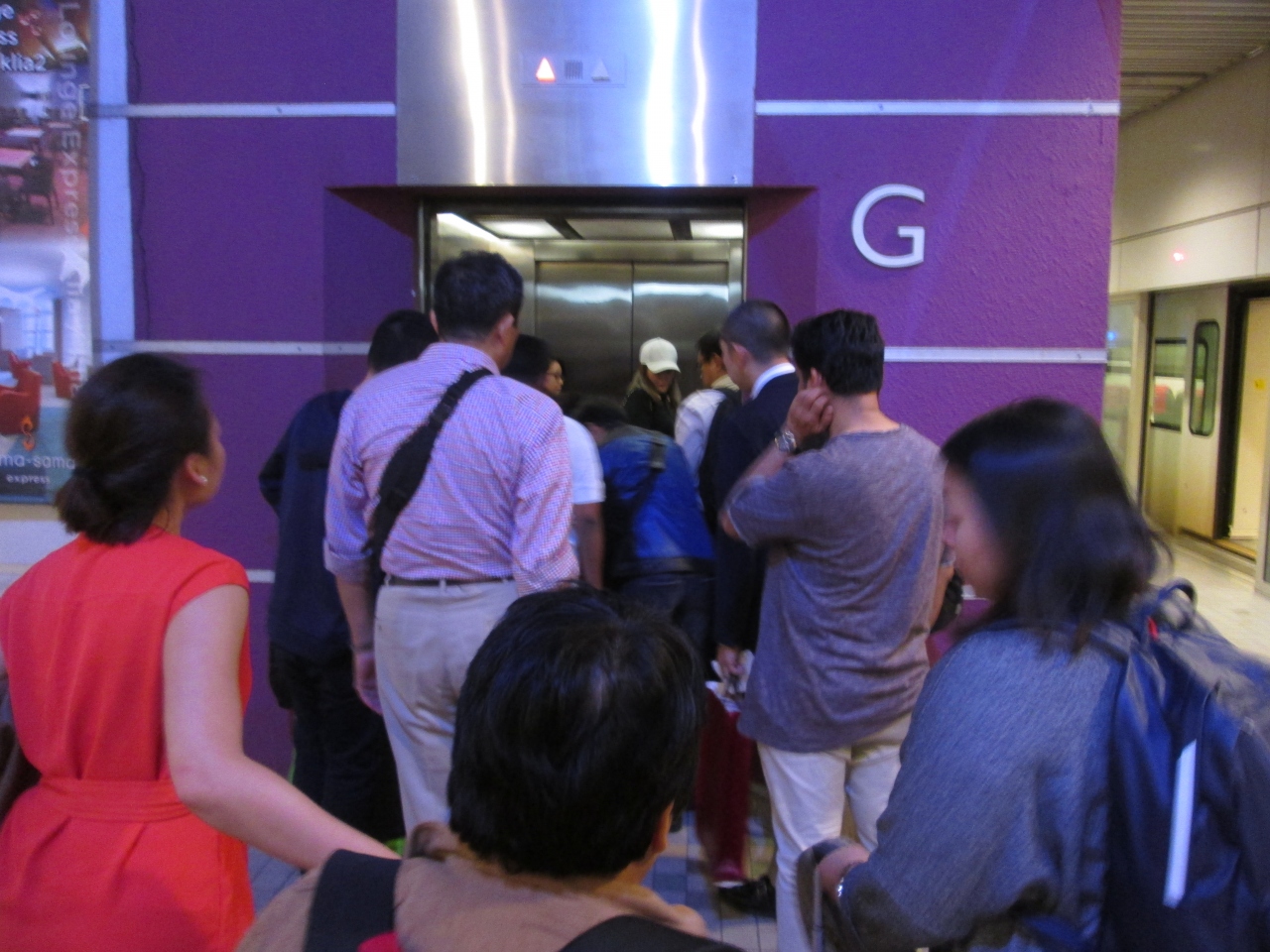 KLセントラル駅のホームから改札口に行くエレベーターは設置されていましたが、容量が小さいのが難で、旅行用のキャスターバッグと人が乗り込むと、3人程度しか乗れなかったです。おまけに上下に移動する所要時間がかかるため、駅ホームで待たされました。