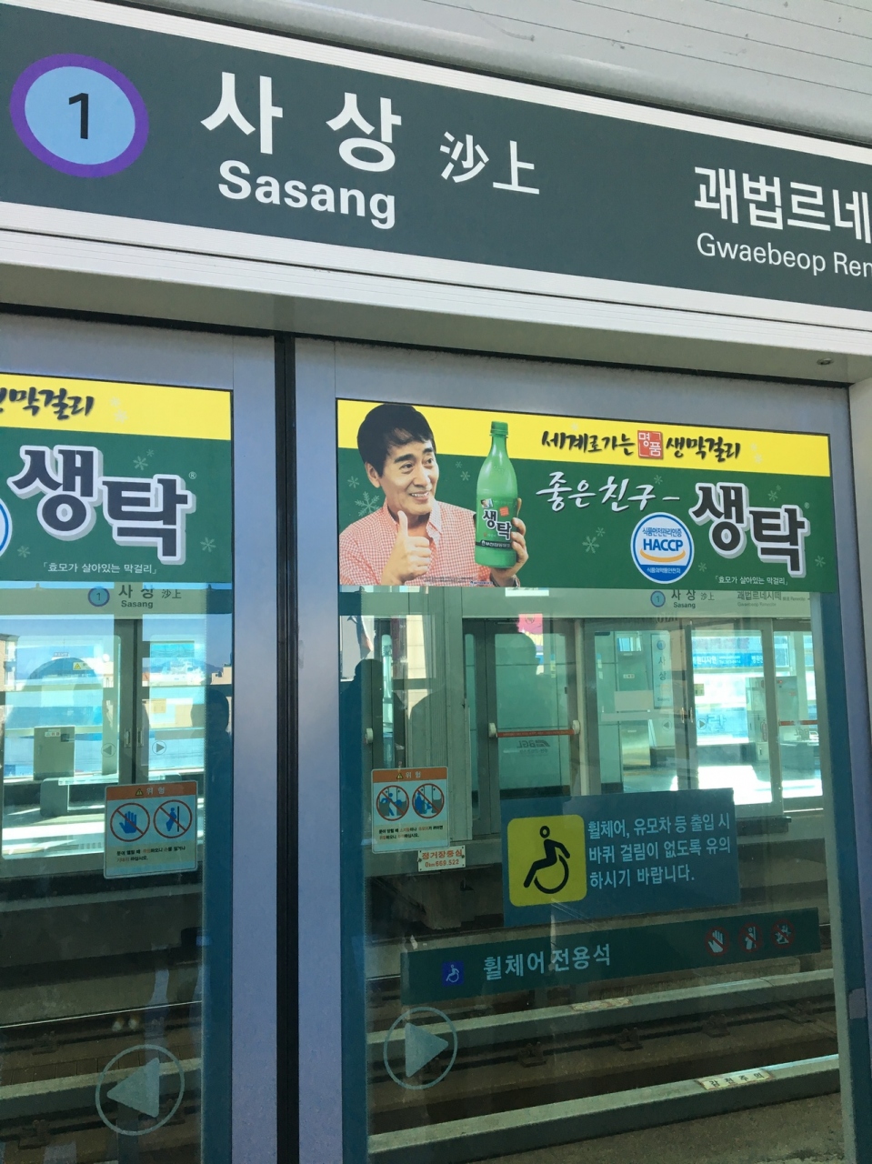 金海空港国際線の到着ターミナルから外に出て、横断歩道を渡り、右手にずっと真っ直ぐ歩きます。徒歩5分くらいで沙上駅に到着します。荷物が多い場合は駅までカートを利用できます。券売機は数個しかないですが、人が少ないためすぐに購入できます。ただ始発駅ではないため、電車はまぁまぁ混んでいて、座れませんでした。