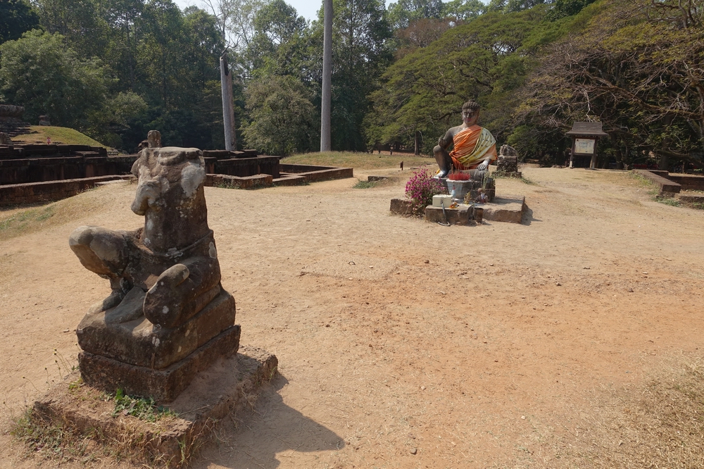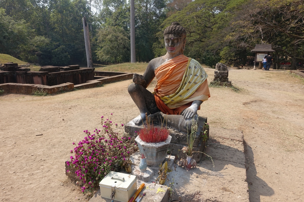 象のテラスのすぐ北側なので続けて観光する流れだと思います。象のテラスとは繋がっているようでいて繋がっておらず、いったん階段の昇り降りがあります。テラスの上にはライ王像のレプリカが置かれていて、線香や花が供えられていました。王の周りにも石像があるのですが頭部がありません(こちらは本物なのかな?)。