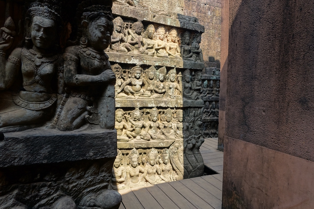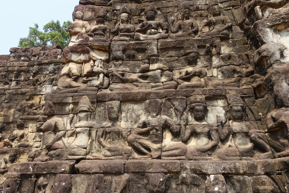 内壁、外壁ともに神、阿修羅、ナーガなどの彫刻がびっしりで壮観です。ライ王像のレプリカだけ見て終わりだともったいないです。また、道路側からだと外壁の彫刻しか見れません。ぜひ内壁と外壁の間の通路も通り、新旧両方の彫刻を見るのをおすすめします。内壁の彫刻のほうが土砂に埋もれていたせいか保存状態がいいように見えました。