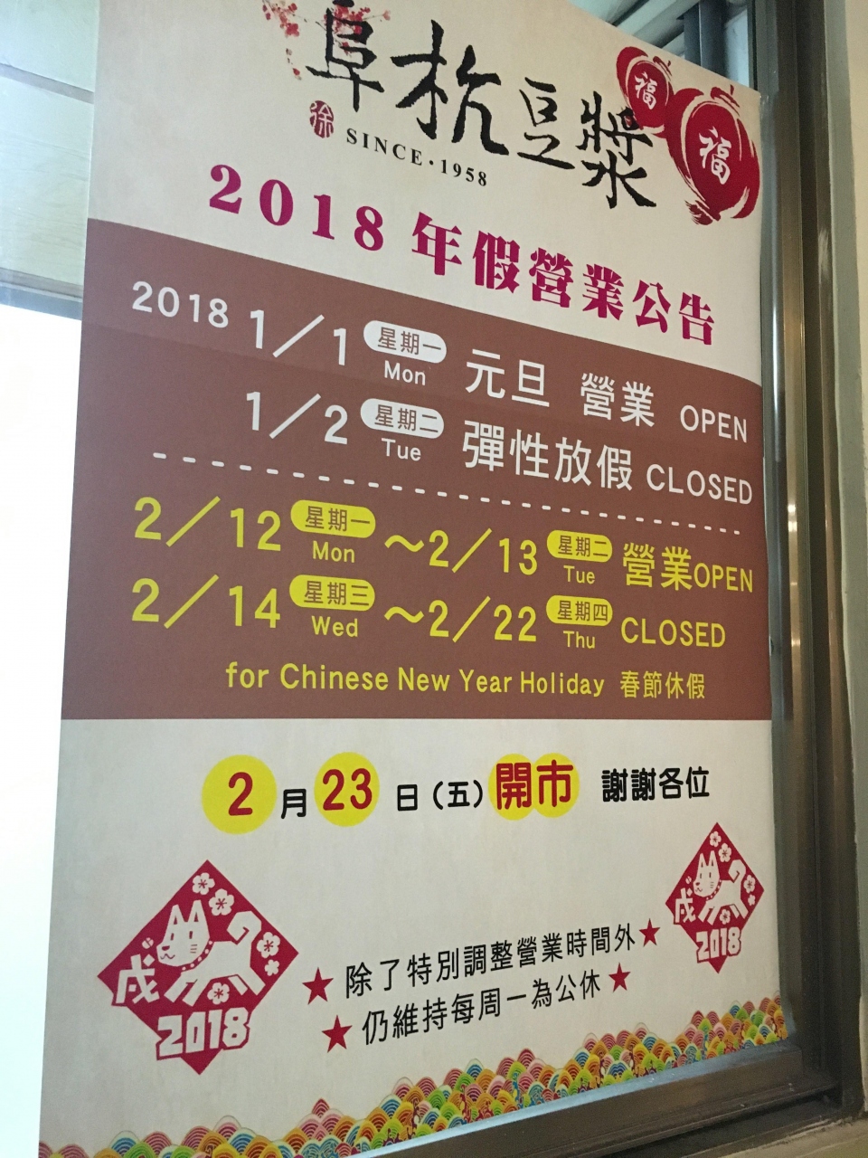 阜杭豆漿 (フーハントウシャン)年始お休み