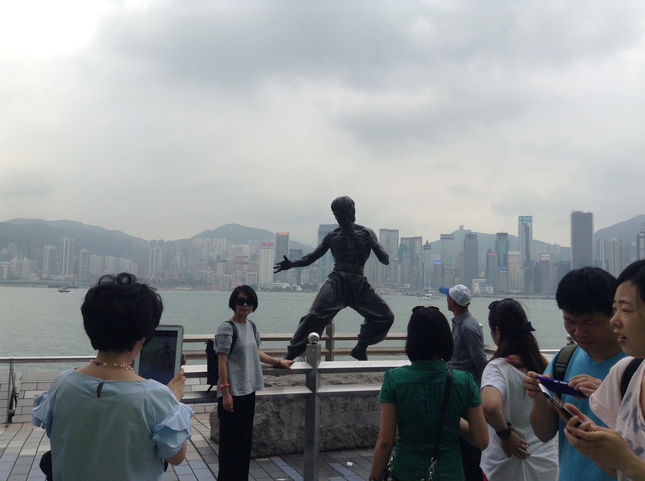 チムサアチョイのプロムナードにあるジャッキーチェンの像。大勢の観光客がその前で写真を取っています。ジャッキーチェン像までプロムナードを歩きますが、人も多いですが景色もよく、香港の景色を満喫できるのでお勧めです。