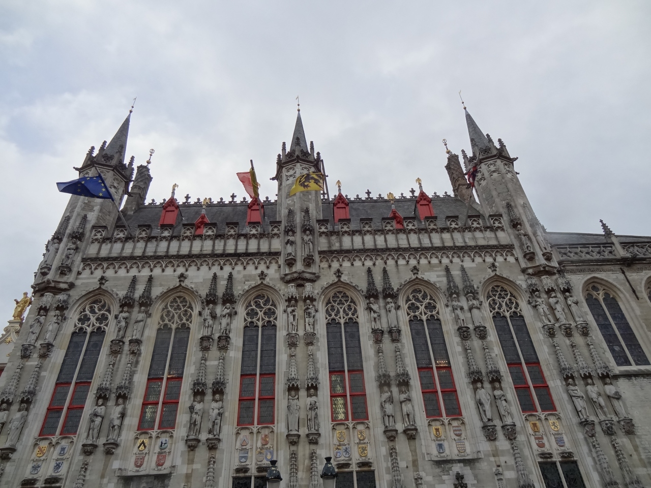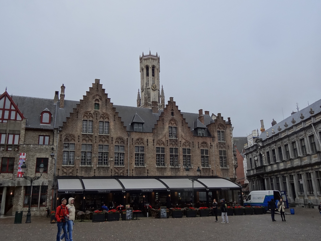 ブルージュの街中にある広場。メルヘンチックな建物に囲まれてお土産ショップやレストランも周りにあります。建物には所々黄金に輝く彫像やギザギザに縁取られた屋根、カラフルな色に塗られた壁が印象的です。小雨が降る中、広場の石畳がしっとり濡れ、さらにロマンチックな風情が漂っていました。