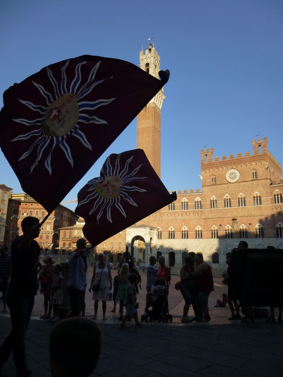 カフェで一休みしていたら、ちょうどパリオの優勝コントラーダの行進(?)のようなものがはじまり、目の前で大きな旗を振る姿を見ることができました。