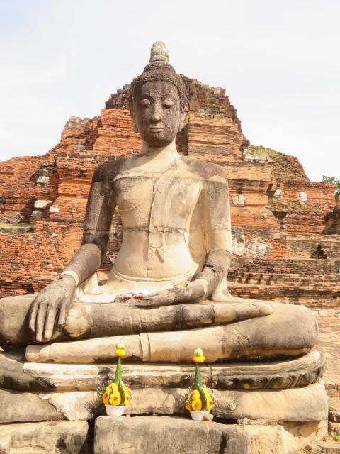 世界遺産の古都・アユタヤの観光スポット、観光パンフレットでよく登場する菩提樹の根っこ取り込まれた仏像の頭部が有名です、アユタヤではワットプラシーサンペットとともに重要な寺院で遺跡内に仏塔や仏像、頭を切り落とされた仏像があり、ビルマ軍によって破壊された姿を眺めながら歩きました。
