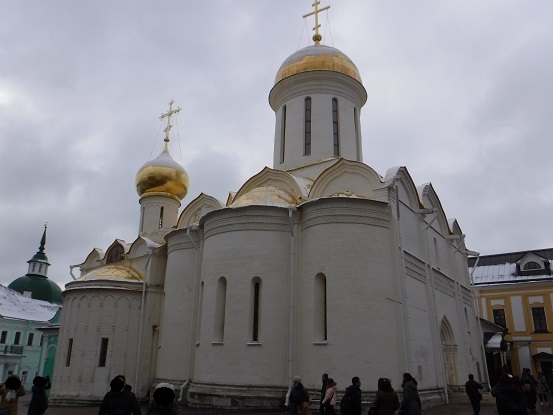 聖セルギーの遺体が安置してあるトロイツキー聖堂は、世界遺産トロイツェセルギエフ大修道院で一番古い建物です。大きくなくシンプルなすっきりとした聖堂ですが、金色の屋根がキラキラととても綺麗でした。観光客が聖堂内の雰囲気を見ることができる場所とは別に、多くの信者が列をなして訪れており、聖堂内に響く聖歌と雰囲気に圧倒されました。信者でない者が長居をするのが憚られたので、早々に出てきてしまいましたが、中の様子が垣間見れて良かったです。