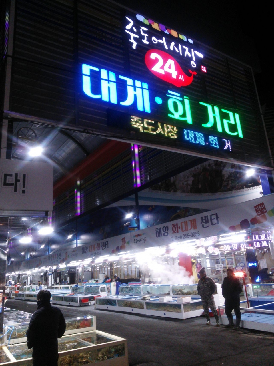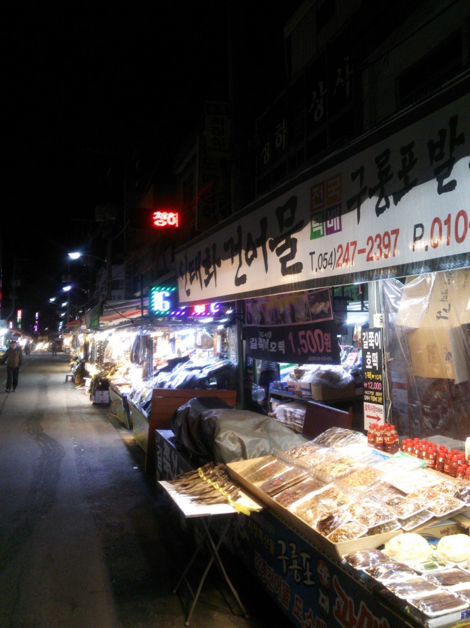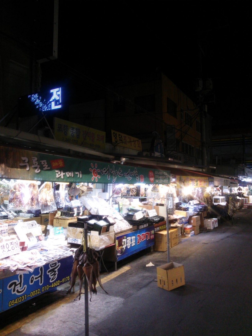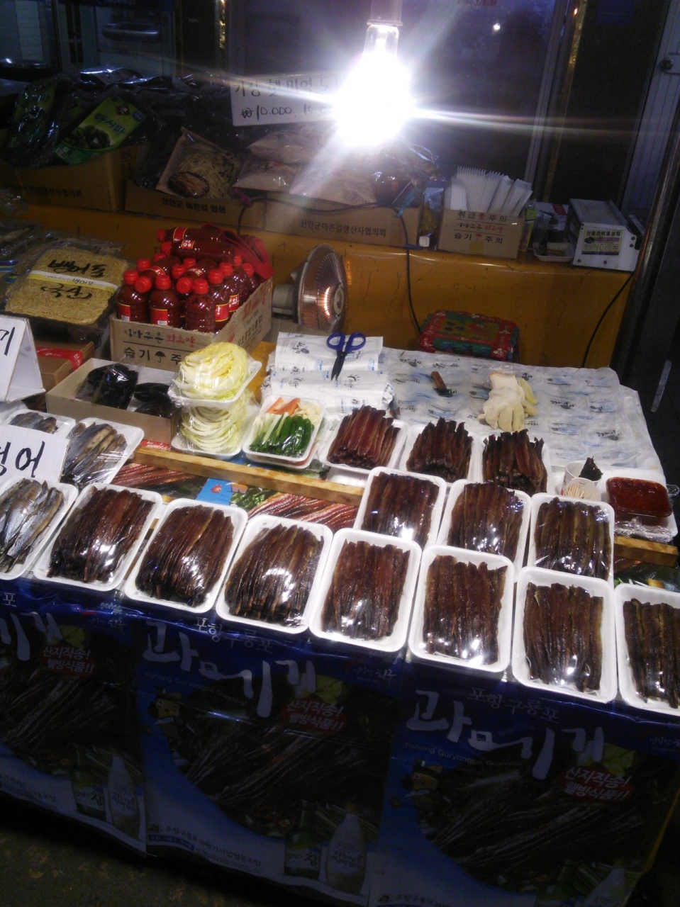 竹島市場は、魚市場以外に、食料品、野菜、衣類、雑貨屋など幅広く出店していて、100won均一のDAISOもありました。