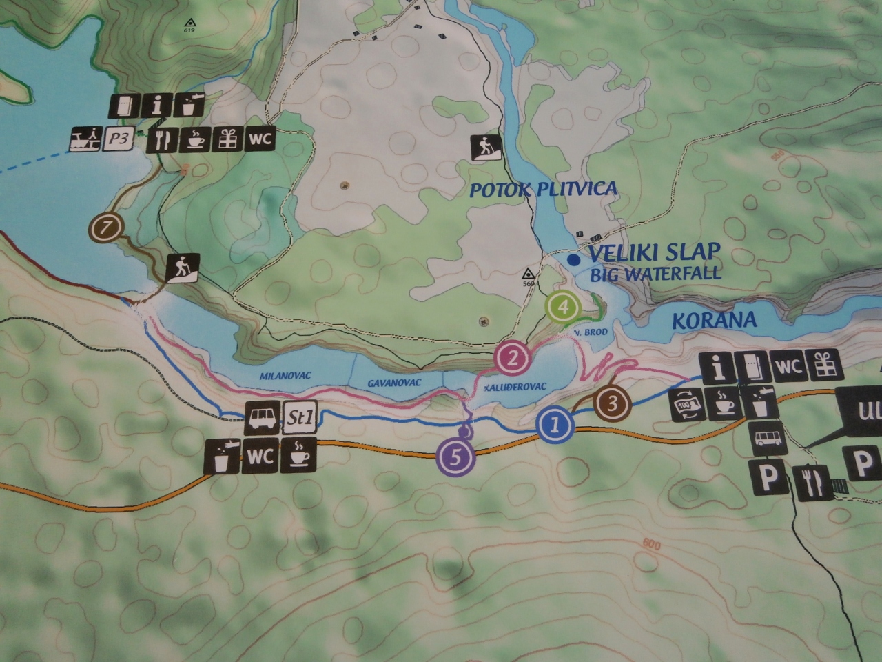 私はエントランス2近くのホテルに泊まったので、遊覧船でP1→P2、P2→P3と乗り継ぎ、P3→Veliki Slap→エントランス1と歩きました。