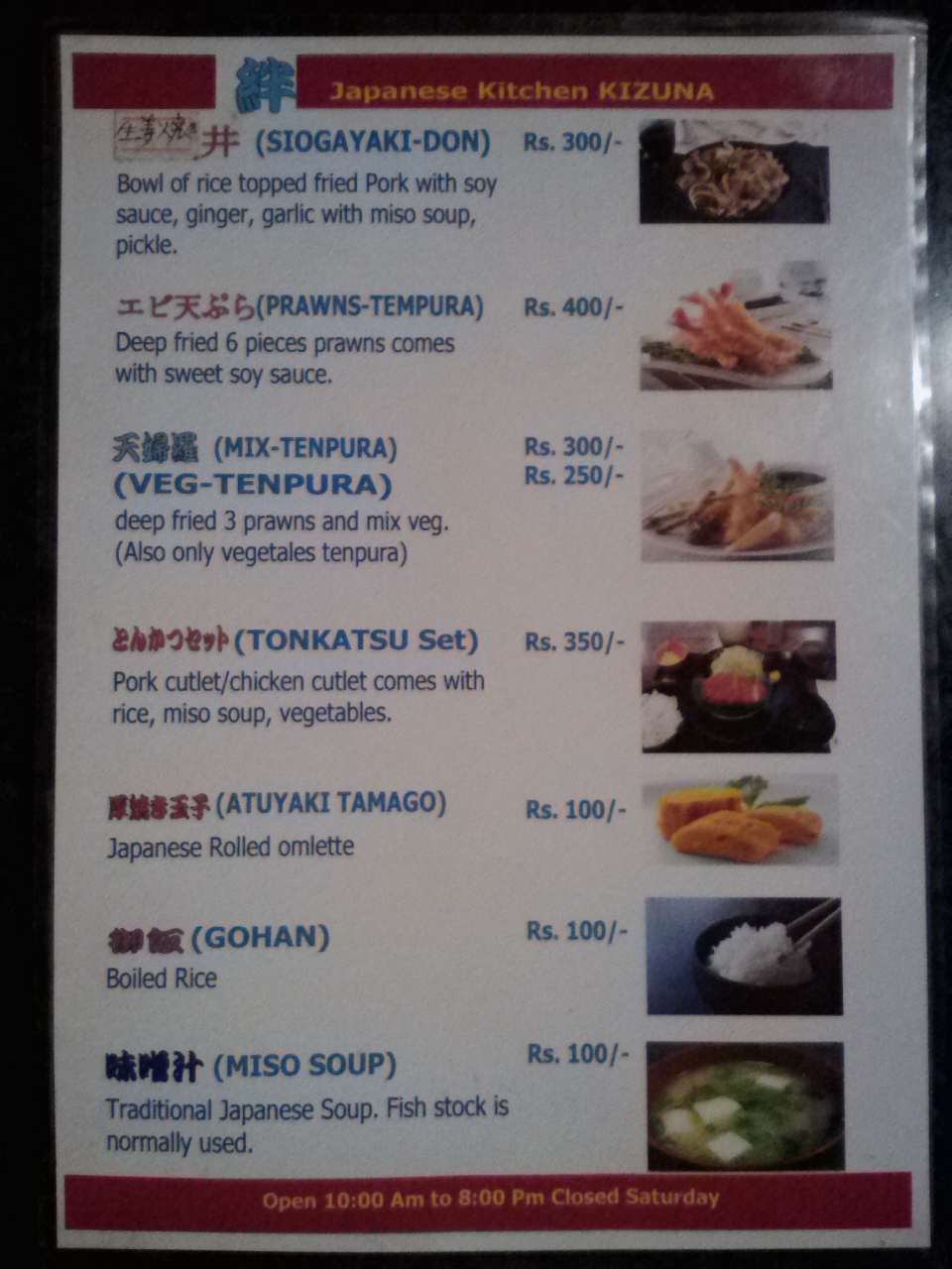 かつ丼(300Rs)を食べましたがうまいです。若干味付けが濃いかなとも思いましたがしばらく日本を離れている方ならダシが染み込んだかつとご飯はたまらなく感じることと思います。味噌汁も豆腐がゴロゴロと入っていて日本の味と遜色ないです。付け合せの大根、ニンジン、きゅうりも軽く漬かっていていいアクセントになります。申し分なし!いい店です。他にもメニューはあるので写真を参照して下さい。