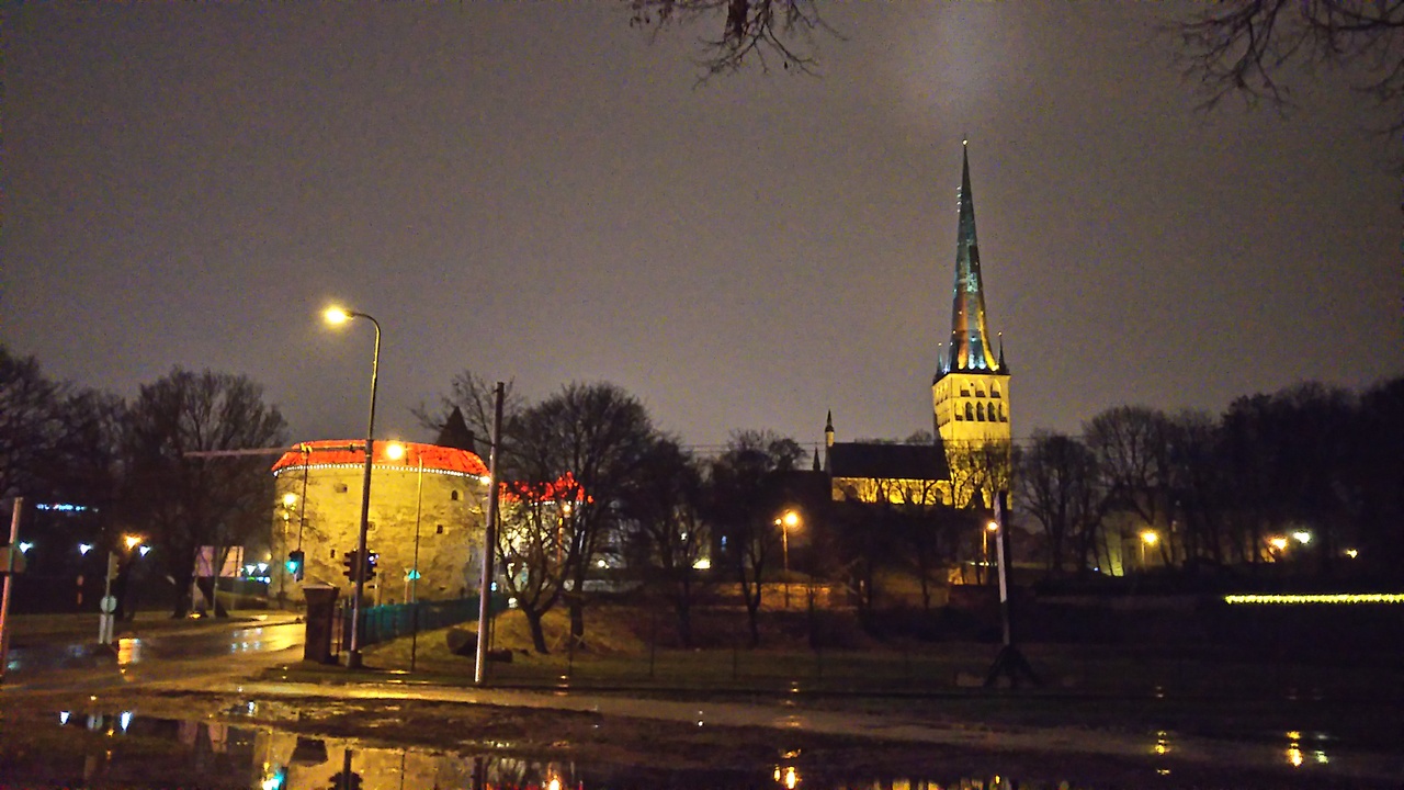 タリン旧市街の北側の端っこにガイドブックでも記載されているふとっちょマルガレータがありました。他のかたの旅行記でも見ていましたが、想像していたよりも存在感がありました。クリスマスだからでしょうか?赤い照明でライトアップされていました。