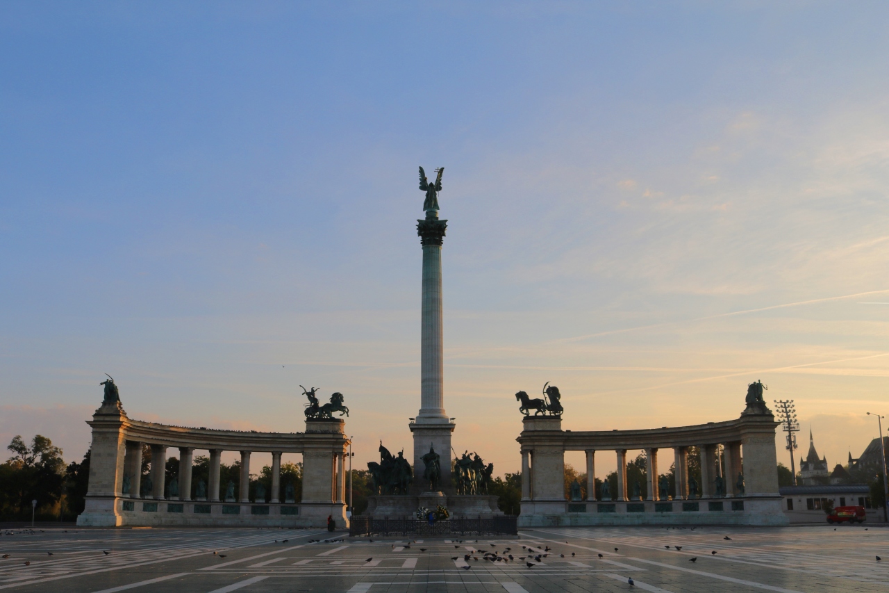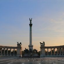 ハンガリー建国1000年を記念して造られたモニュメントには、中央の大天使ガブリエルを固めるように聖イシュトヴァーンらハンガリーの英雄14名の銅像が並ぶ。台座には9世紀後半にこの地にやってきたマジャール人の首長アールパードら7人の部族長らの姿。騎馬民族を起源にもつハンガリーらしく、なかなかかっこいいモニュメントです。