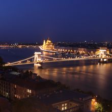 王宮のテラスからならほぼどこでも鎖橋と国会を同時に捉えることができるけど、オススメは王宮の南端。ここからなら木々が邪魔にならず、そして人も少ない。ドナウ川にかかる鎖橋と国会議事堂。昼間でも十分美しかったけど、ライトアップされるとその輝きが一層増して見えます。
