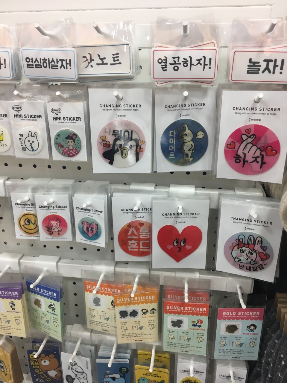 お土産を買いに、可愛い雑貨が売られているアートボックスに行きました。こちらは、キャラクターグッズや文房具など女の子が好きそうなものがたくさんあります。ハングルが好きなので、可愛いステッカーやノートを購入しました。