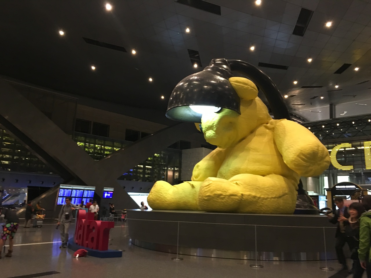 カタール航空で成田空港から約12時間 中東のカタールの首都ドーハにある、ハマッド国際空港。カタール航空が本拠地とする とても綺麗で、広い空港です。その中央に、天井まである、大きくて。とても愛嬌のある、黄色のクマが目印としています!