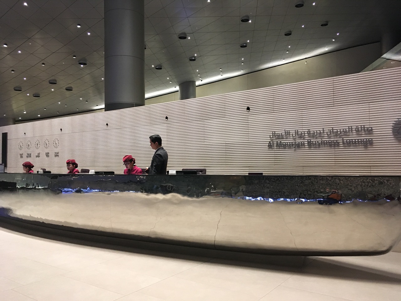 ドーハのハマッド国際空港の黄色のクマさんから免税店の中、エレベーターがあり、そこを上がると、このラウンジはあります。入室すると、なんと体育館よりも広い空間、2階はダイニングスペース! 中央に、プールのような池がぁーー! 色々な椅子で、空間を区切り、ゆっくりくつろげました。2階のダイニングテーブルが、2つあり、それぞれ違う美味しそうな料理が、ならんでいました。時間調整の中、ゆったりと、旅の疲れがホット一息つけました。