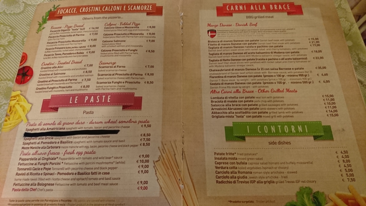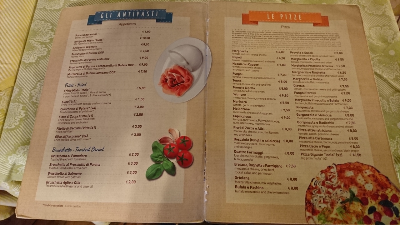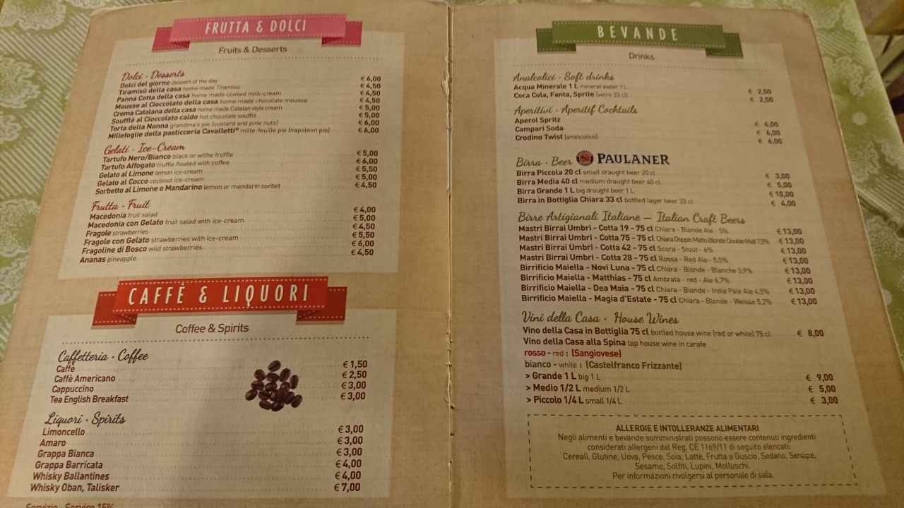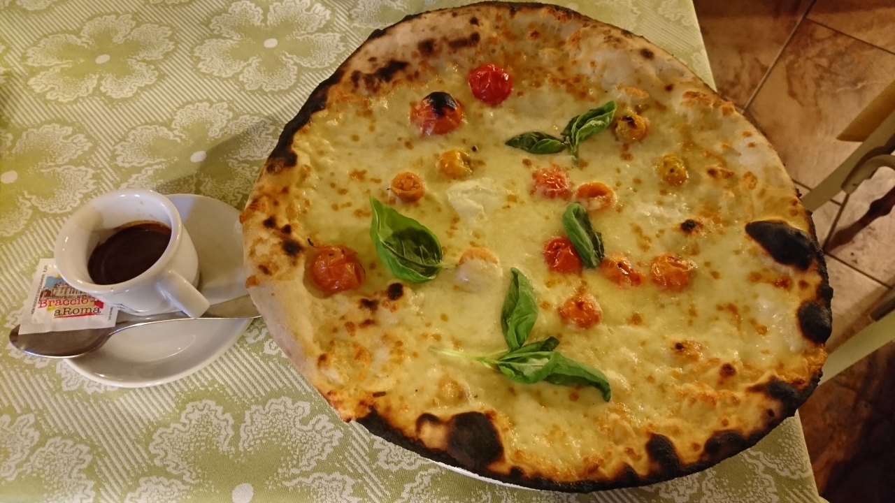 ピザ8ユーロとパスタ8.5ユーロの他、パンナコッタ4.5ユーロとエスプレッソ1.5ユーロを注文。