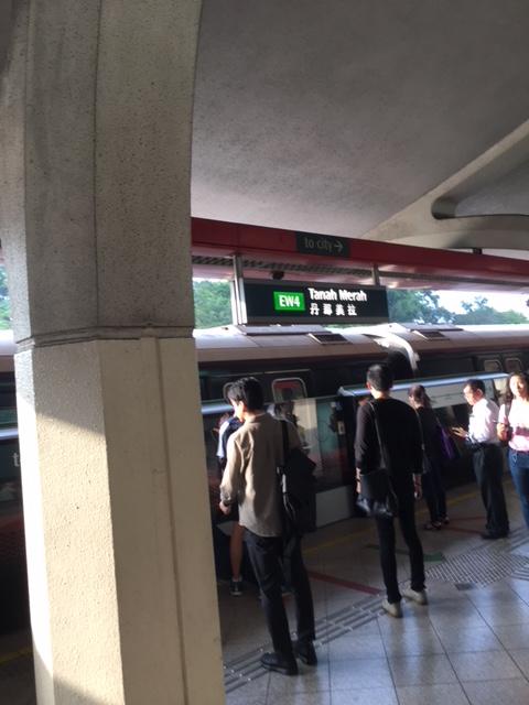 空港の地下のチャンギ エアポート駅から地下鉄に乗り、2つ目の駅です。このタナ メラ駅でイーストウエストラインに乗り換えて、ブギス駅まで移動しました。空港からシンガポールの市内へ地下鉄で移動するには、この駅での乗り換えが必須です。ちょうど電車が到着した時に向かい側のホームにイーストウエストラインの電車がきたので、乗り換えはとてもスムーズでした。