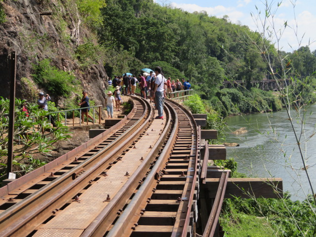 旧泰緬鉄道のクウェー川鉄橋駅から観光列車に乗車してアルヒル桟道橋近くのタムクラセー駅に、到着前に列車はゆっくり橋を渡りました、車窓からアルヒル桟道橋の一部を見ることが出来ました、スリルがあります、駅を降りてから線路を歩いてアルヒル桟道橋に行くこともできるし、そばから眺めることもできます、旧泰緬鉄道の見所の一つです。