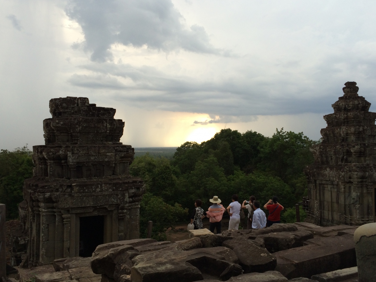 入場は17:30までで人数制限もあるらしいので早目に行きました。頂上には夕日を待つ人が徐々に増えてきました。石に座って夕日を待っている間、はるか遠くには大きな稲光りがいくつも、雨が降り出すのではとやや不安に。ギリギリ綺麗な夕日を見ることができました。