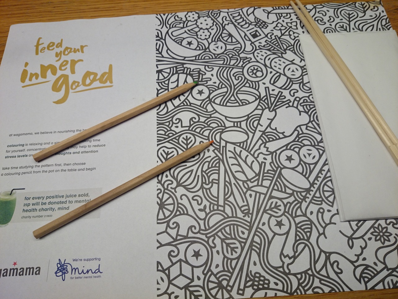 テーブルクロスが塗り絵になっていて、色鉛筆も各テーブルに有りオシャレです。