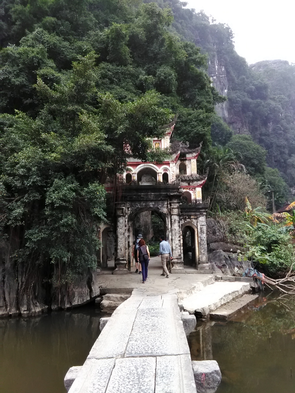ホテルで自転車を借りて付近を散策をすることにしました。パゴダがあるというので20分ほどのところに山に寺がありました。駐輪場に停めると有料でした。寺自体は無料です。外国人が何組かいました。池を越えて門をくぐり井戸や寺を見学しました。竜やライオンの石の彫刻を見ました。階段を上ってさらに上の建物にいきます。上からの見晴らしはとてもよく静かで気持ちのいい場所でした。暗い洞窟が続いていましたが引き返して来ました。