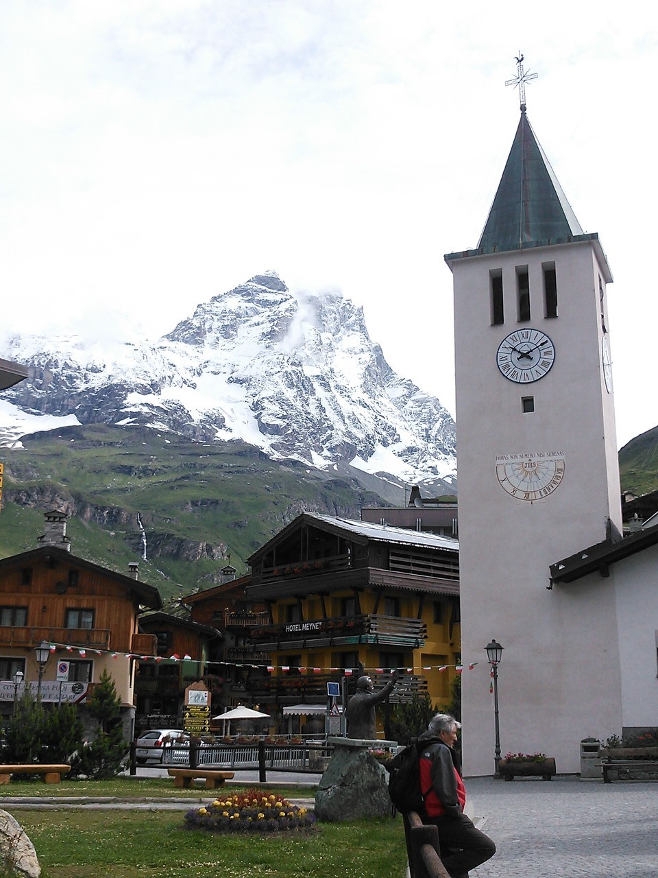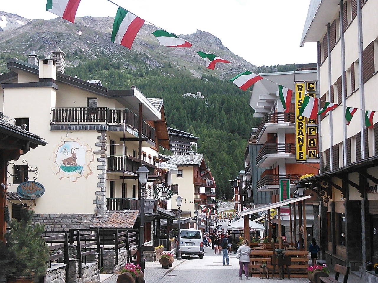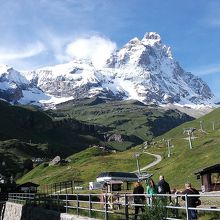 ミラノから高速バスでアオスタへ、アオスタから電車とバスを乗り継ぎチェルヴィニアへ行けます。電車、バスの待ち時間を入れて3時間半くらいです。チェルヴィーノ(マッターホルン)が間近に望める絶景です。ホテルは多数あり、レストラン、お土産やさんもたくさんあります。チェルヴィニアのバス停の近くにはスーパーがあり便利です。