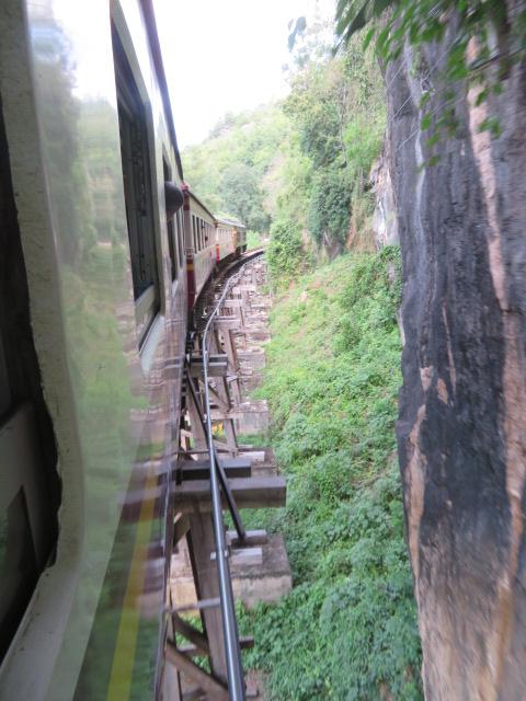 映画戦場にかける橋の舞台、クウェー川鉄橋を渡る列車で多くの観光客が乗車してました、レトロな列車で快適とは言えないが、その歴史を思い浮かべて1時間ちょっと楽しみました、車内からの風景も楽しめました、タムクラセー駅近くのアルヒル桟道橋は最大の見所です。