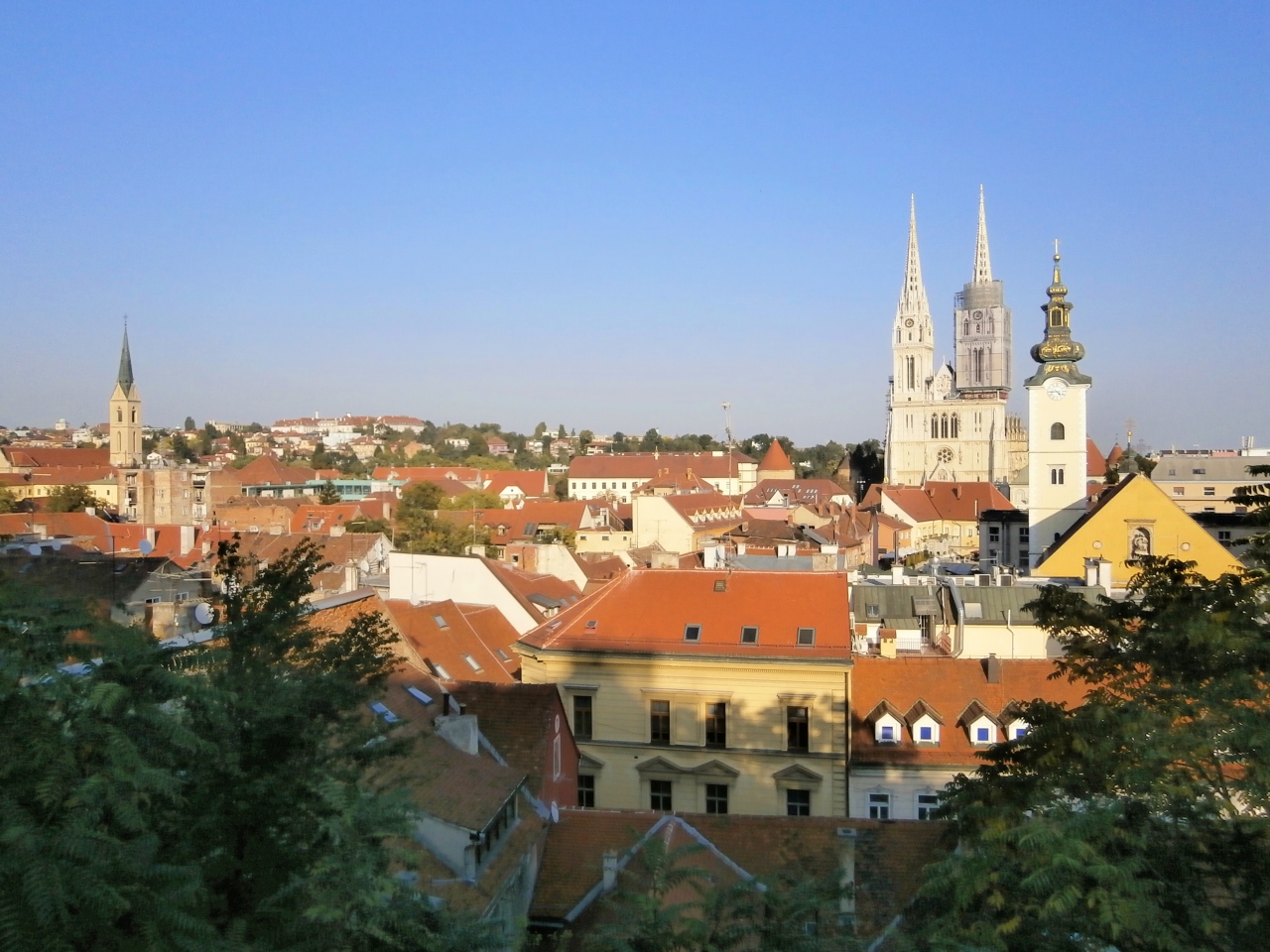 白壁で簡素な外観に比べ内部はバロック様式の装飾がみごとらしいのですが、残念ながら正面の扉は閉まっていました。ほかに入口はないかなと横手へ回ってみると広場があり、驚いたことにそこはザグレブの街が一望できる場所でした。