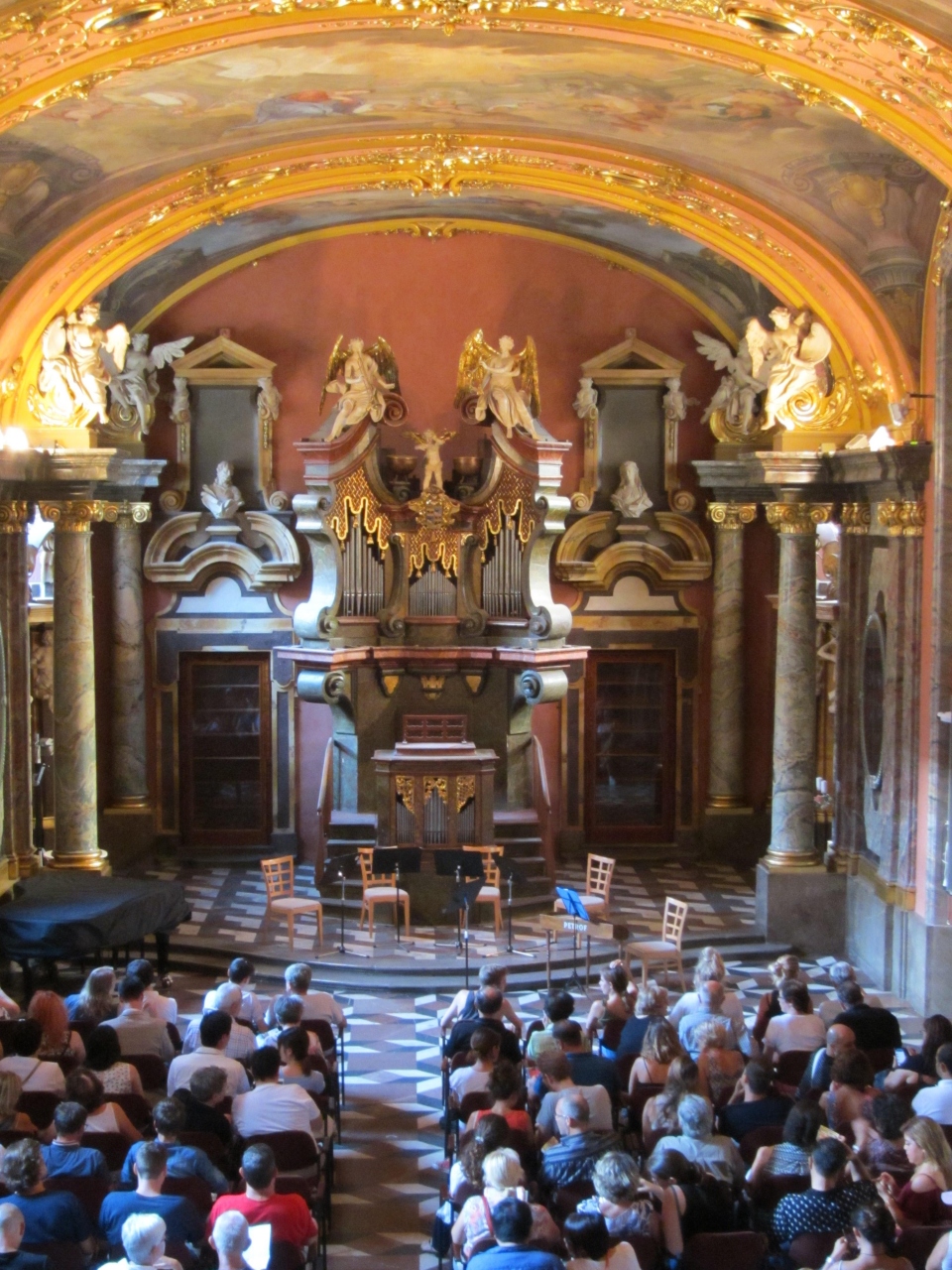 クレメンティヌム内にある鏡の礼拝堂でコンサートを聴きました。上の階の中央席に座りました。上から見下ろすので会場全体の雰囲気を味わうことができてよかったです。ドボルザークの曲や、ヴォルダウ川などのよく知っている曲を演奏してくれました。