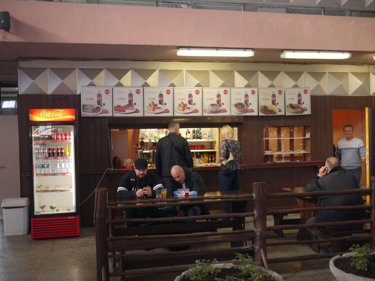 この市場で、フィッシュアンドチップスが食べられると聞いていたので探したところ、たしか10ユーロ以上したので、半ばあきらめて歩いていました。すると、軽食が食べられるコーラ推しのお店を発見。ここでも魚料理が食べられるらしく、値段も安いようなのでここに決めました。