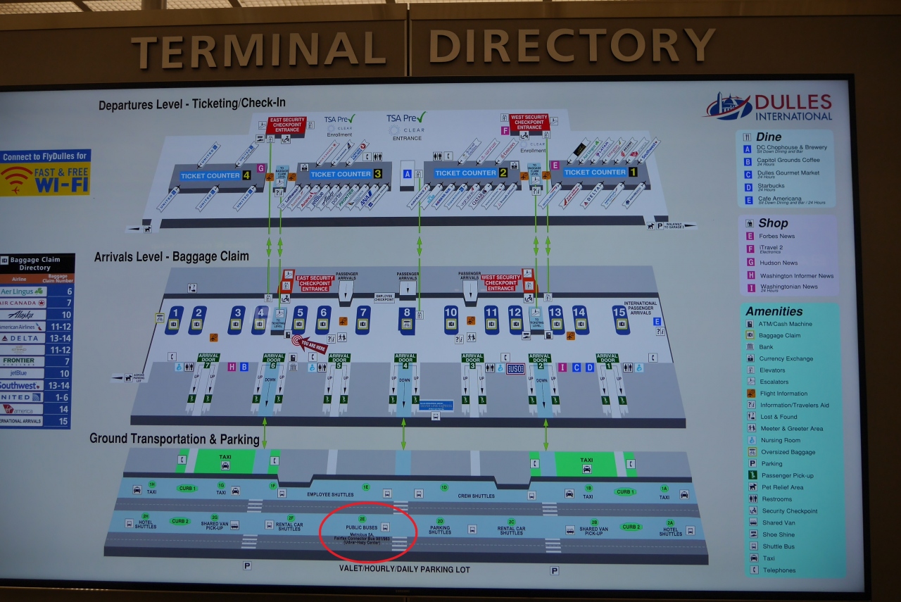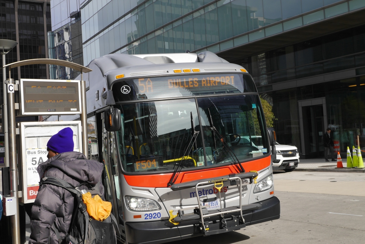 ワシントンダレス空港とワシントン市内を結ぶメトロバスは高速道路を使って片道50分程度かかります。空港のバスレーン2Eは何か所かありますが、メトロバス5Aの表示のあるバス停で利用できます。