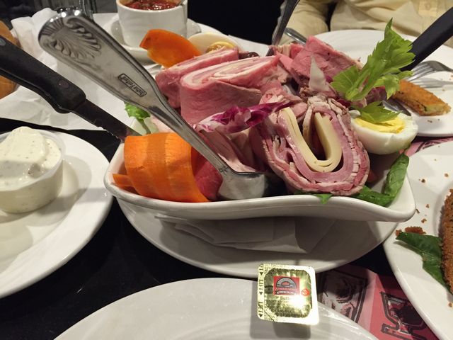 で、前菜にフライの盛り合わせとハムチーズサラダを2人でシェアで頼んで、メインには「ステーキ!」をオーダー。