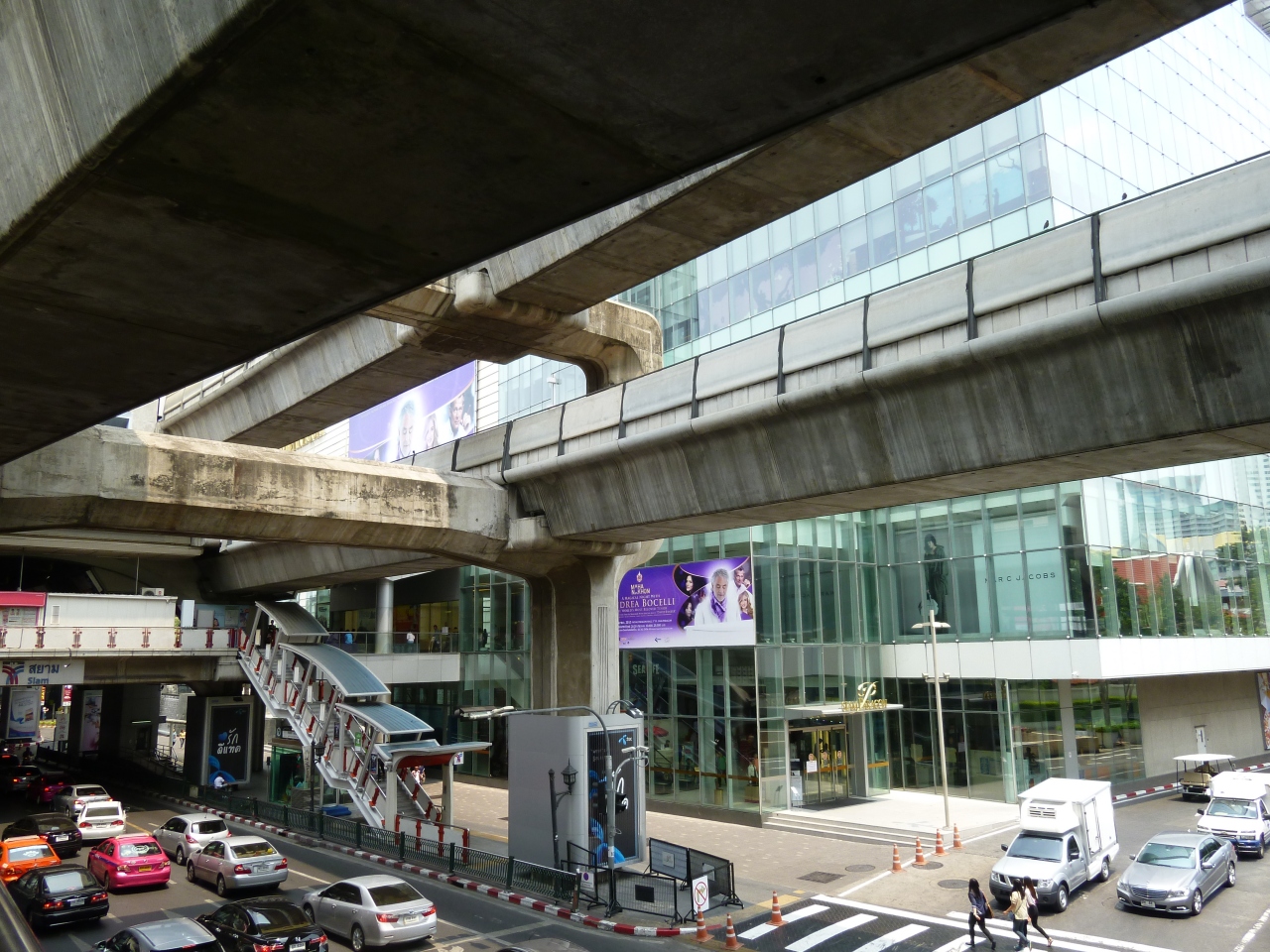 バンコクの市内鉄道BTSがこの道の上を高架で走っています。