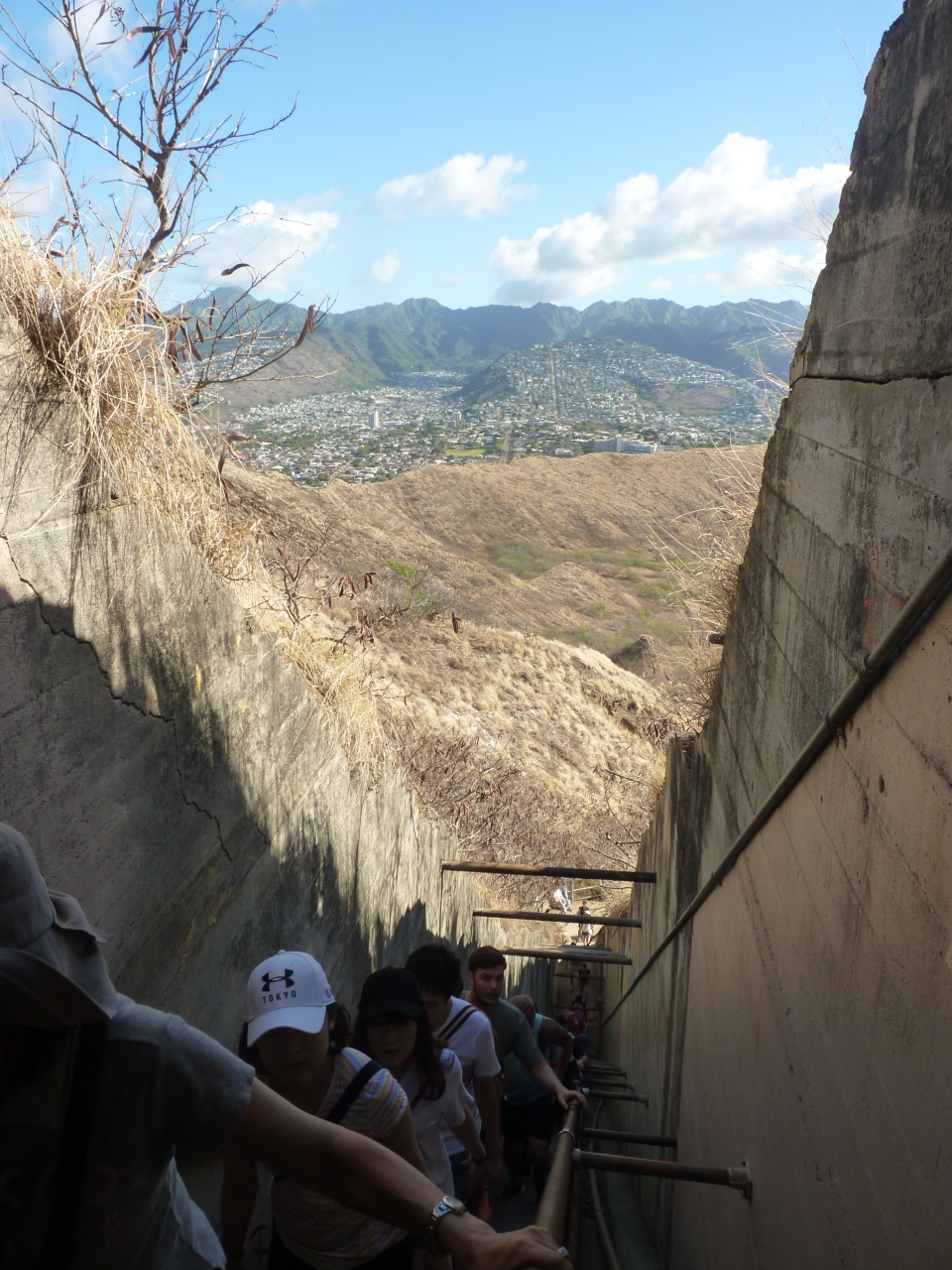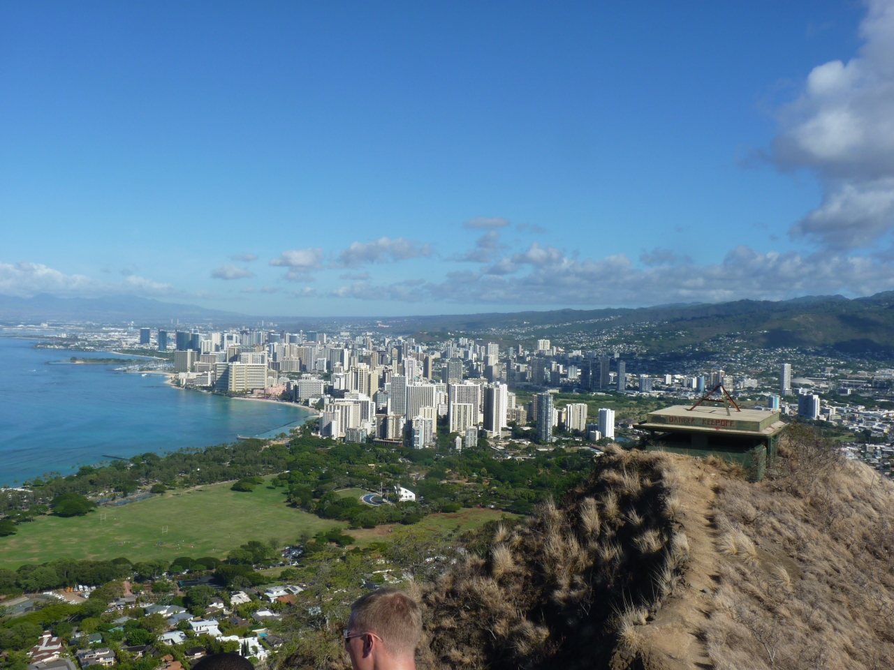 情報では朝方に登るほうが涼しくて登りやすいと聞き、入山料を払って8時ごろに出発した。最初はなだらかなアプローチだがだんだんと勾配が着いてくる。300m足らずの山だと舐めてかかったが、日財をさえぎるものは無く、全く熱い!最後の登りも階段つきの急勾配でやっと頂上へ出れる。しかし頂上からの眺めは最高・・・・