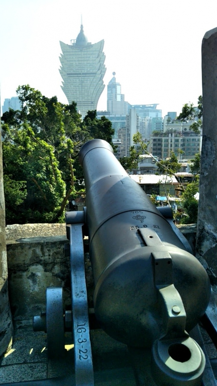 マカオ博物館のエスカレーターを上っていくとモンテの砦に出ます。そこではいくつもの大砲を見ることができます。繁華街側にある大砲の正面にはカジノで有名なグランドリスボアがありました。まるでグランドリスボアを狙っているような感じです。モンテの砦からはマカオの新旧の街並みを感じることができました。歴史的には砲撃戦が続く中、ポルトガルが放った大砲がオランダ軍の火薬庫に命中し、それがきっかけでオランダ軍がマカオから撤退したのだとか。ここも時代の波を超えて超えて今があるんだなあと感慨深くなりました。