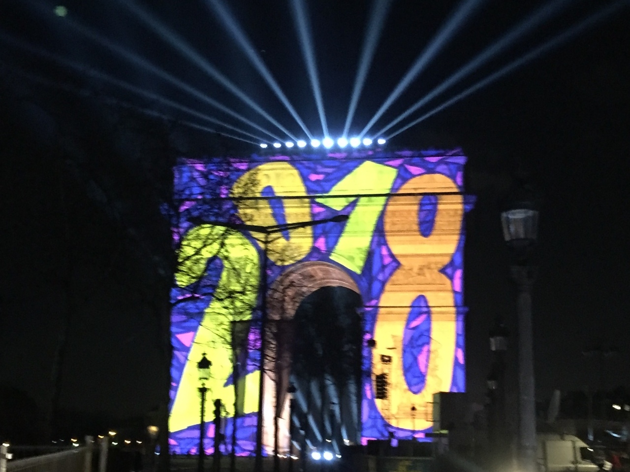 夜9時ごろ凱旋門周辺に到着。カウントダウンまでまだ時間はありますが、より凱旋門近くに行く為この時間にしました。私達は凱旋門の裏側のホテルに宿泊していましたが、近くからはシャンゼリゼ通りには入れませんでした。観客が空いている場所まで脇道で移動させられます。カウントダウンはプロジェクションマッピングで楽しませてくれます。とても感動しました。