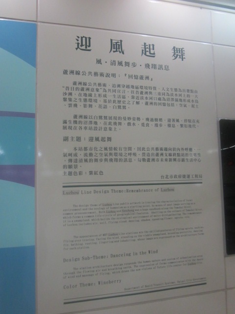 大橋頭駅で分岐する西のオレンジラインの北側を走る蘆州線の終点駅となっているのがこちらです。蘆州線の他駅と同様、この駅の付近も元々は水鳥達の生息する自然豊かな場所であったそうで、現在は都市化が進んでいて、駅前も高層マンションが立ち並んでいて、台北およびその近郊地区の都市化の凄まじさを感じることが出来るエリアの一つかと思います。同路線の他駅と同じく、鳥アートも展示されていますし、桃園空港行きの三重客運バス(986番)に乗車も出来ます。(この駅前が同バスの始発(終着)駅となります。)
