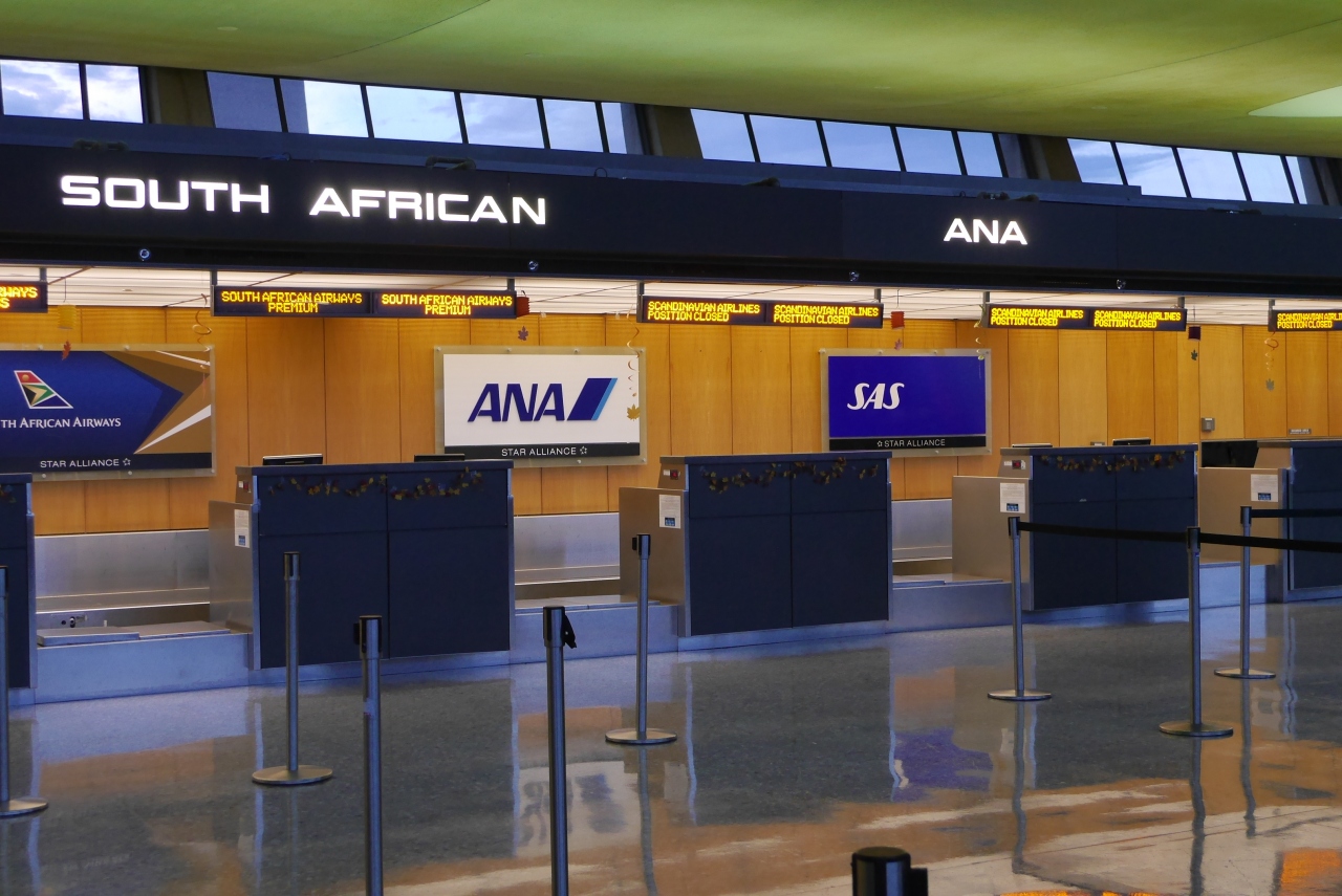 ANAは11時前の出発で、カウンターは7時半頃オープンします。両隣のカウンター、南アフリカ航空とSASの2カ所をANAに替えて、3カ所のカウンターを使っていました。