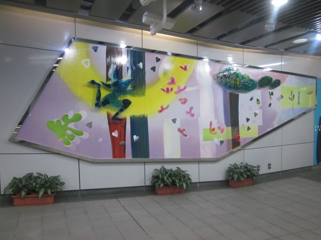 MRTレッドラインとブラウンラインとの接続駅となっている駅で、両者の乗り換え通路は結構距離がありますので、時間的な余裕を十分に確保しておく必要のある駅です。そんな中で、駅構内の魅力としては、レッドラインのホームに近い側のコンコース壁面上にさりげなく展示されているお洒落なアートで、可愛らしい風情の作品が、付近の喧騒に癒しを与えているような雰囲気が素敵でした。