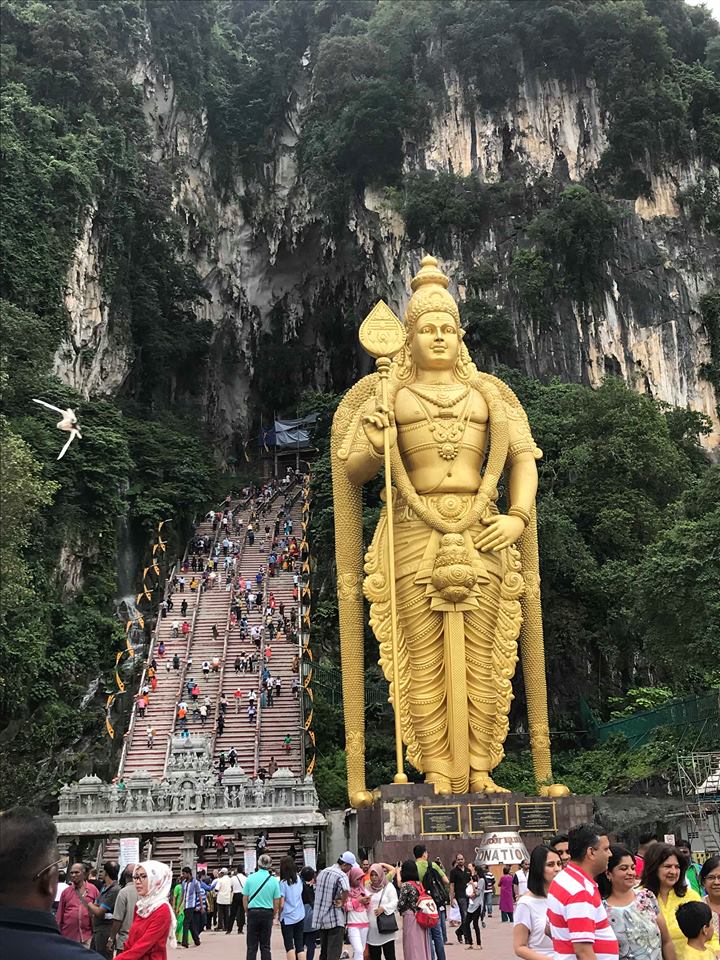 巨大な金色の像の横には272段の大階段があります。遠くからでも圧倒的な階段は、いざ上るとなると圧倒されてしまいます。階段を登り終えると洞窟があります、さらに進むとまた階段があり、ちょっと心が折れそうになりますが、上の方には寺院があり、荘厳な気持ちにます。