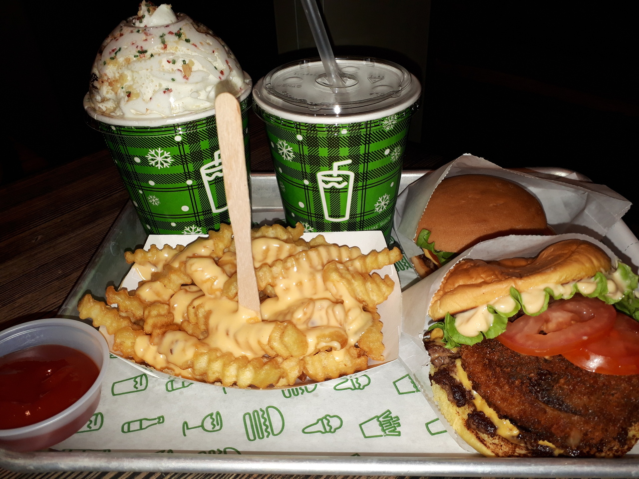 ツアーにラスベガスのシェイクシャックの券が付いていたので食べに行きました。月曜日の夜9時過ぎに行ったのでガラガラでした。ニューヨークは混んでて並ばないと食べれない噂を聞いていたのでちょっと気抜けしてしまいました。私はヘルシーなバンズで挟んだハンバーガーを頼みましたが、あっさりしていて夜食には良かったと思います。でも娘がハンバーガーのほかにポテトも注文して。そのポテトがカロリーがありそうなどっさりボリュームがあるもので…胃もたれるする感じでした。アメリカらしいといえば其れまででしょうが。ポテトにソースがかかっていました。娘が店員に聞かれてオーダーしたみたいです。ハンバーガーの味は私が期待し過ぎたせいか普通に感じました。店はニューヨークニューヨークのそばなので分かりやすいです。