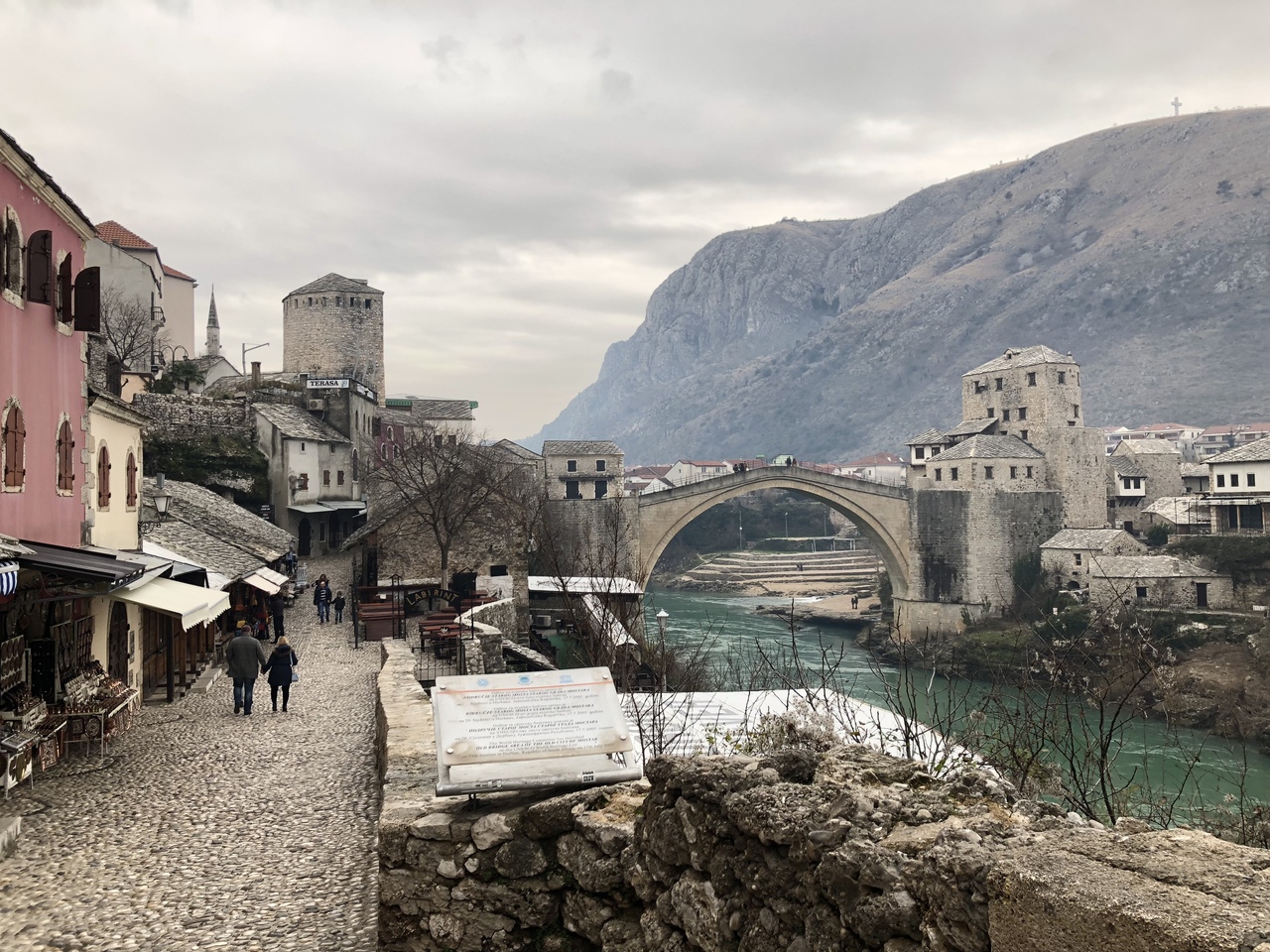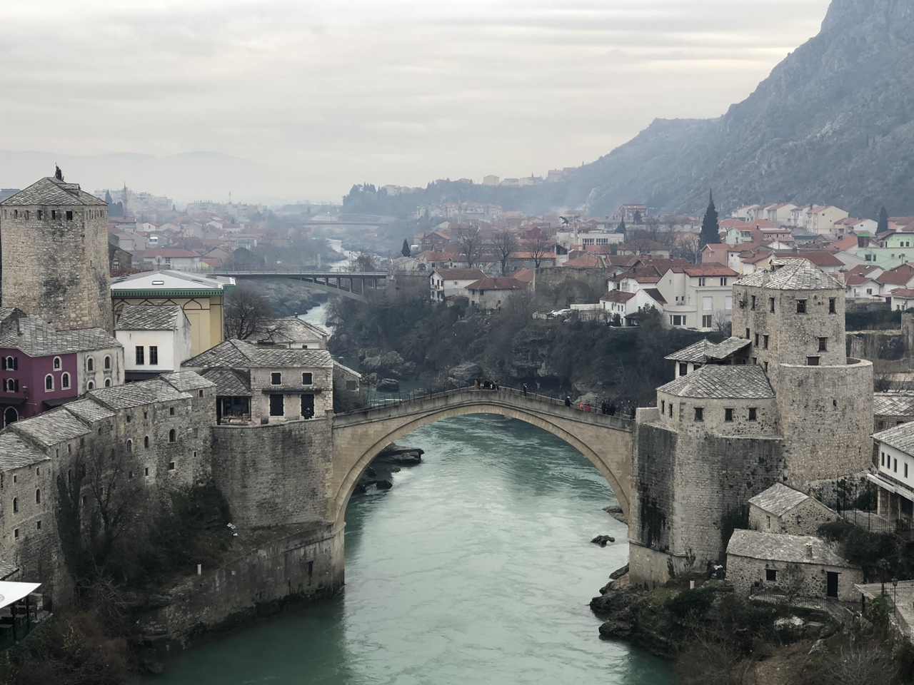 1993年の内戦時に一度破壊された石造りの橋で、オリジナルはオスマントルコ時代に建てられたものです。綺麗なアーチを成しており、川に架かる姿は目を引きました。モスタルのシンボル的な存在であり、観光客が多く集まっていました。