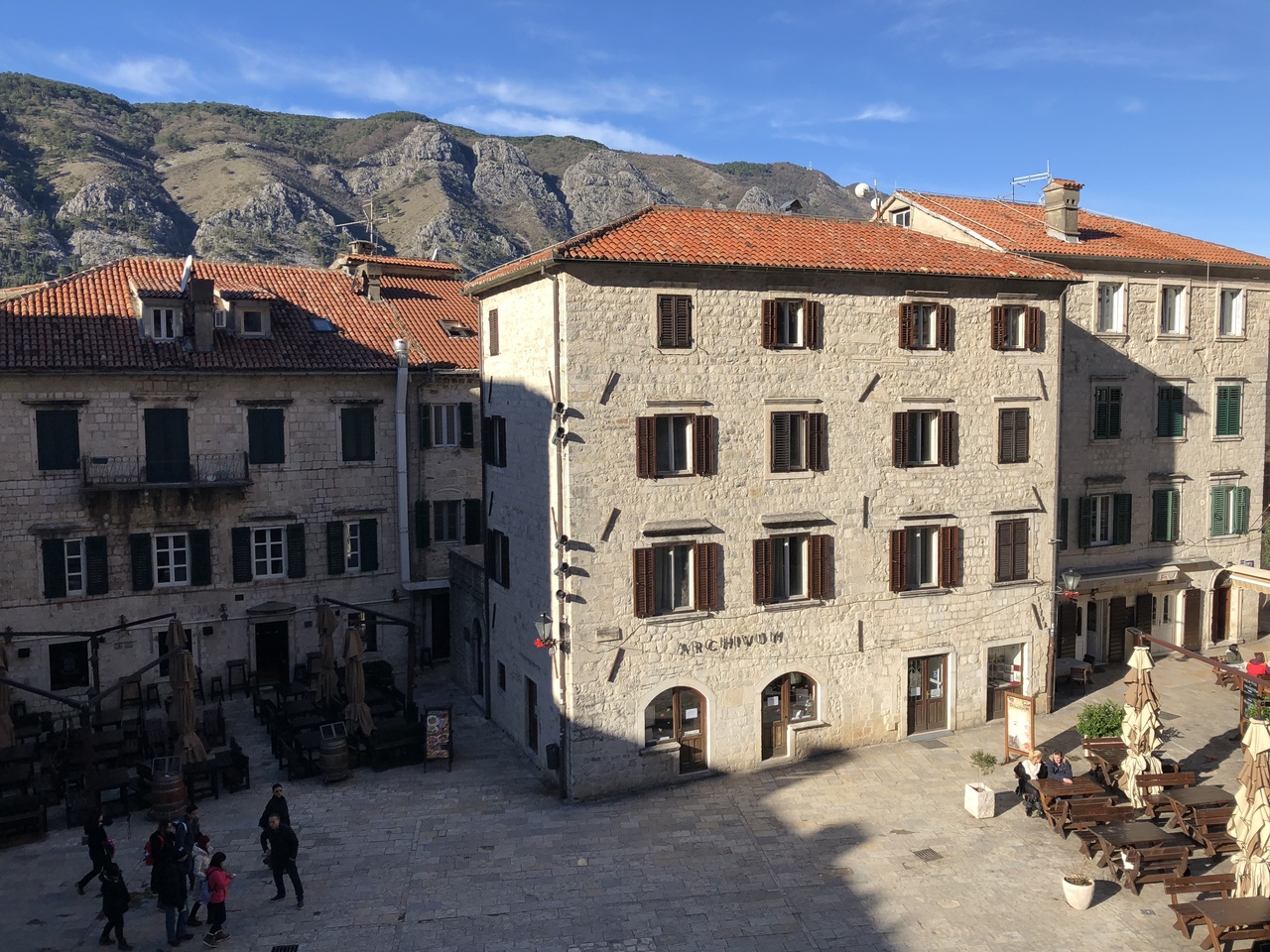 聖トリプン大聖堂前の広場で、石畳が敷き詰められています。観光客がひっきりなしに行ったり来たりしており、周囲にはオープンカフェが広がっていました。冬場はさすがに寒いため店内で温かいコーヒーを楽しむ客が多く、夏の繁忙期をほうふつとさせました。