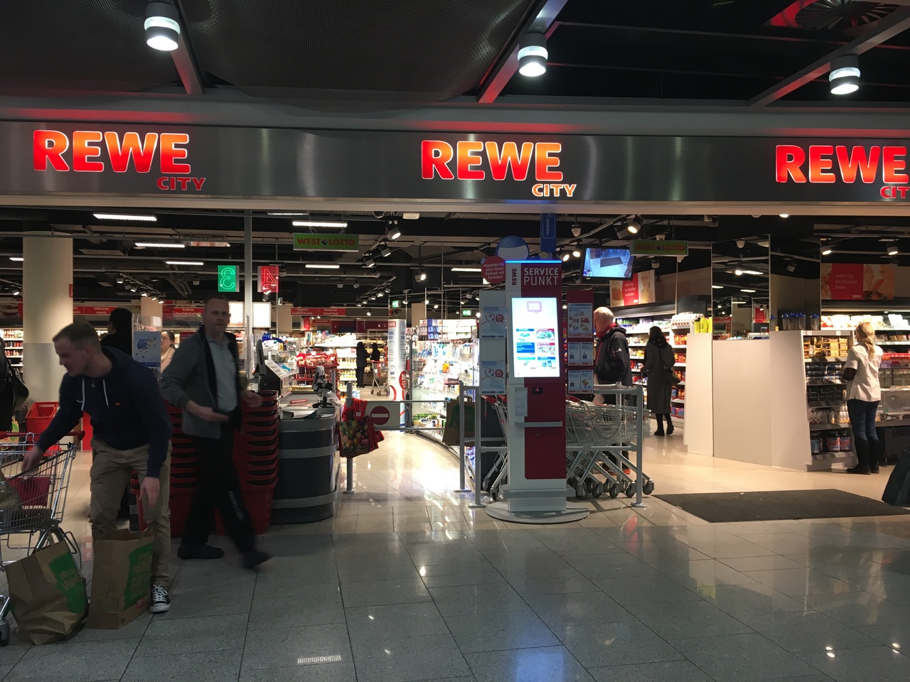 到着階の一番奥にドイツの大手スーパーであるREWE レーヴェがあります。品揃えもそこそこあって、バターやチーズを買ってスーツケースに入れて預け荷物にすれば、日本まで冷え冷えで持ち帰ることが出来ます。ハーブティーや台所用品などの日用品もあります。旅の最後の買い物場所としてもおススメ出来ます。