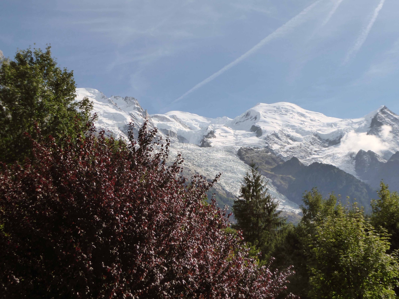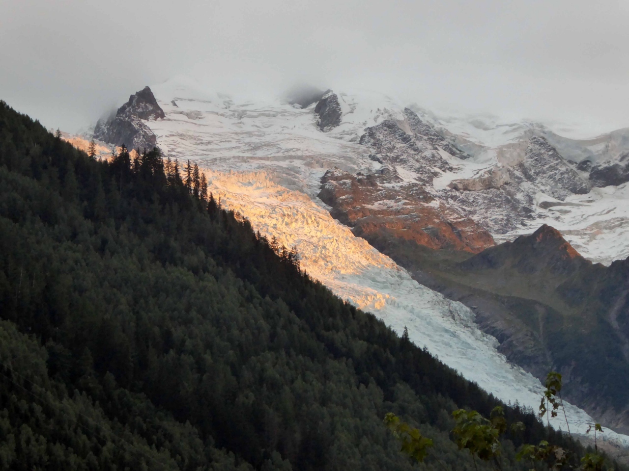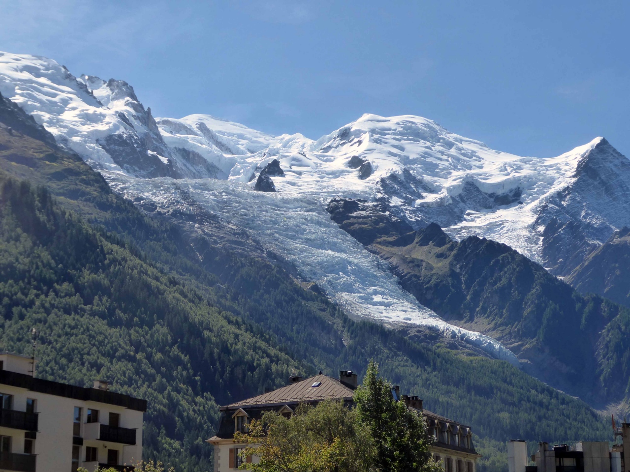 モンブラン山の山肌をシャモニーに向けて流れる氷河で、町中から眺めることができます。時間によって日の光の射し方も異なりますので、氷河の印象も時間帯で変化します。シャモニーの西側に聳えるプレバン山の頂上あるいはプランブラーの展望台から眺めると、見る角度が違いますので印象も異なります。やはり高い場所から眺めた方が迫力がある感じでした。