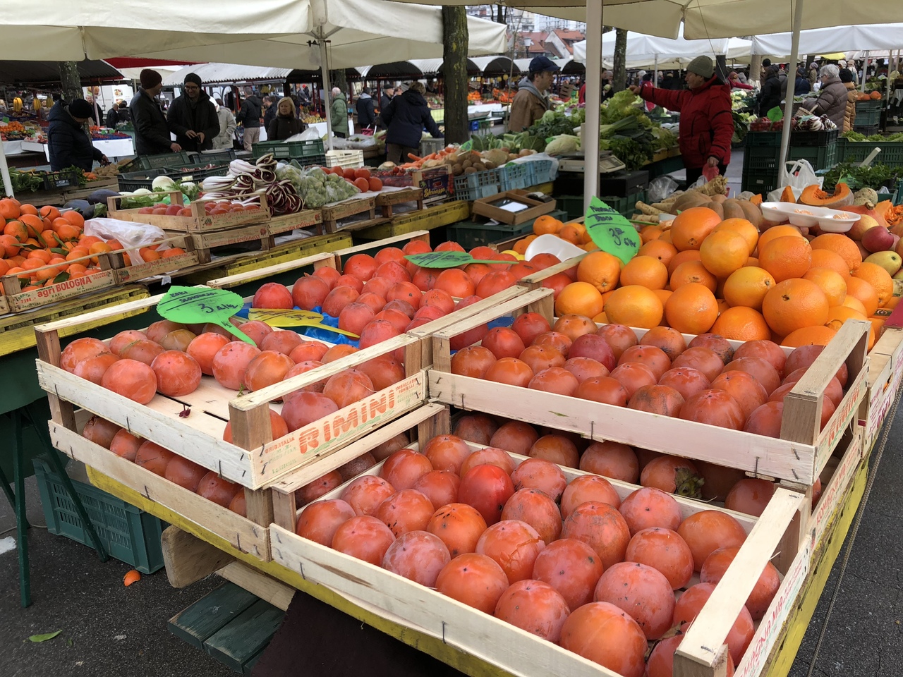 リュブリャーナの広場で開かれている青物市です。私が訪れた冬の時期でも輸入品を含めて多種多様な野菜や果物が販売されていました。驚いたのは日本でいう柿が販売されていたことです。結構大ぶりの品種で、もちろん甘柿でした。新鮮な商品が並び、観ていて楽しかったです。