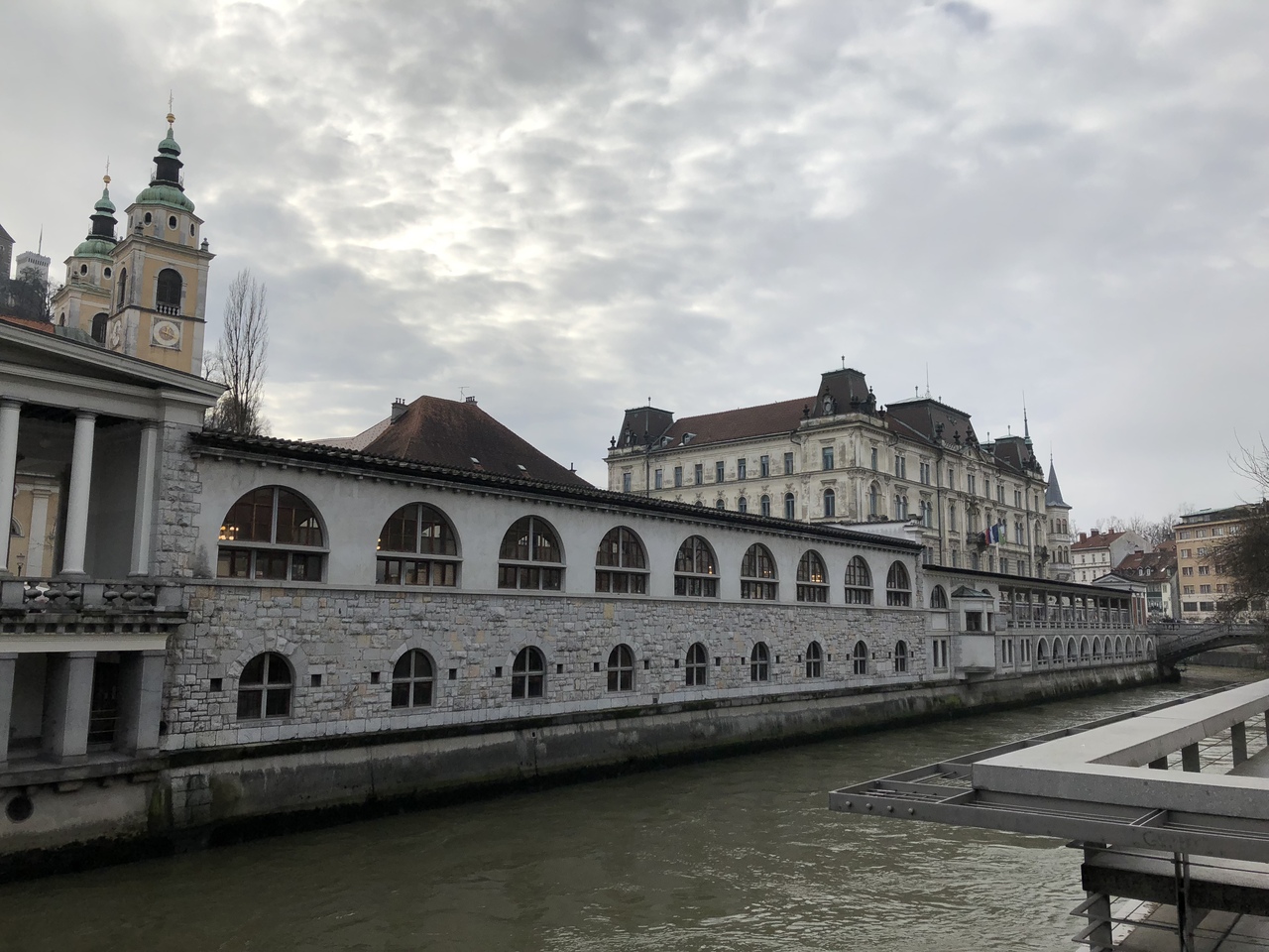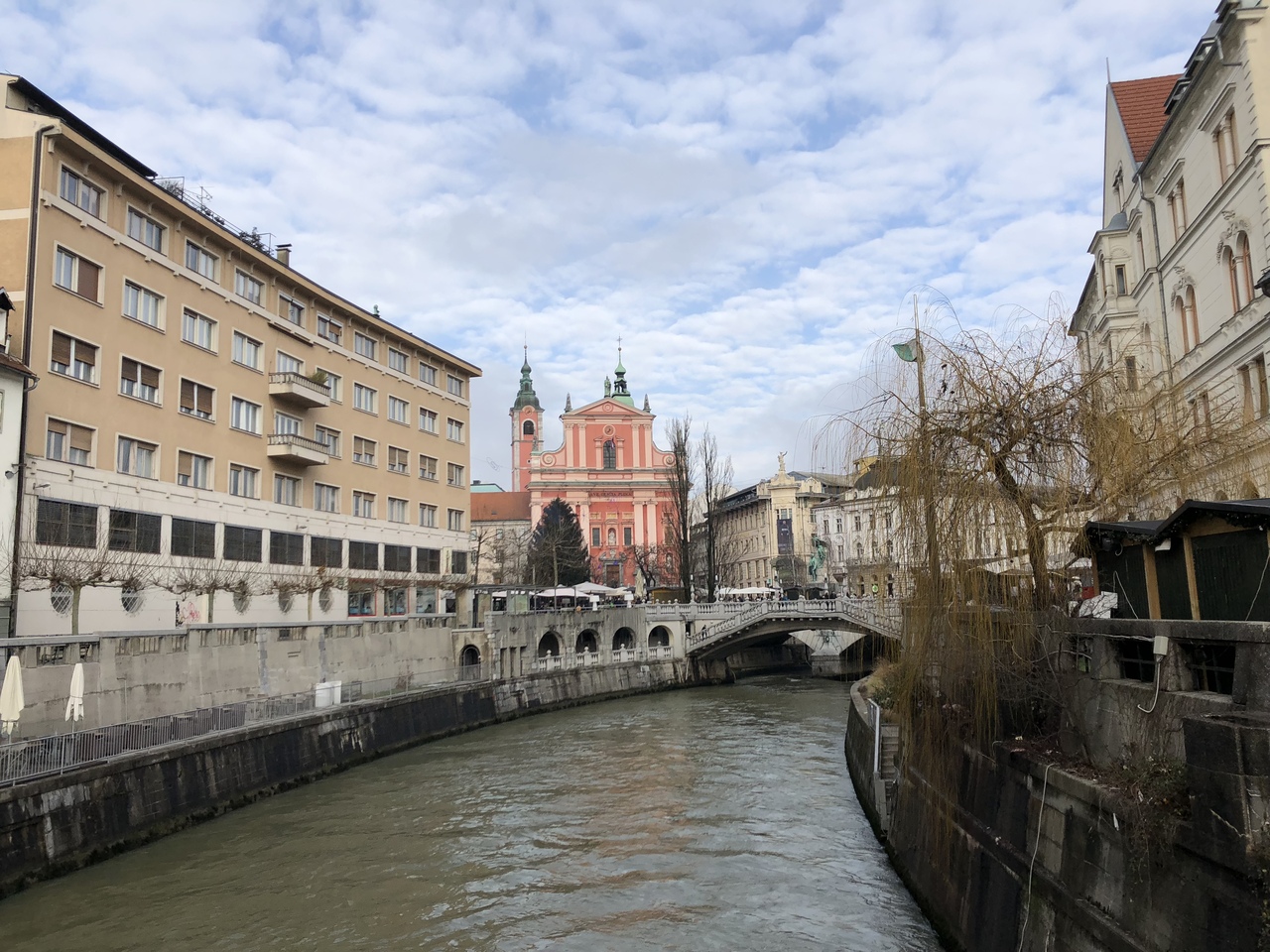 リュブリャーナの街を貫流する川であり、その名にもリュブリャーナが付いています。尾の川とお城を中心に街が形成されており、川に架かる三本橋や竜の橋、肉屋の橋(ブッチャーズブリッジ)や川沿いのフランシスコ教会など、観光名所も多いです。冬の期間は運休していますが、夏場はクルージング船が行き交うようです。穏やかに流れる川で、橋と写真に映すと画になりました。